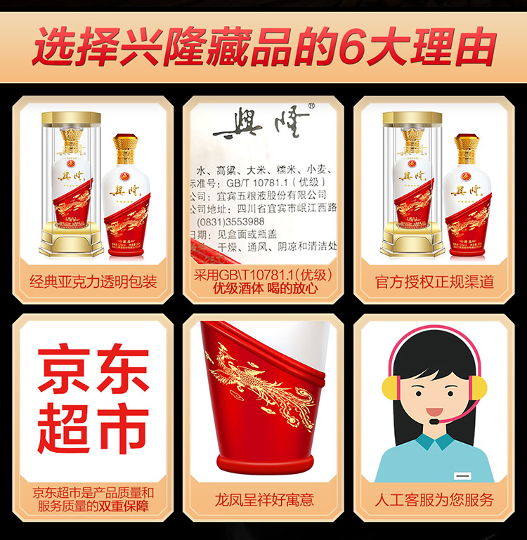 包装:整箱装;容量:500-749mL;香型:浓香型;产地:河北;度数:50度及以上;酒精度:52%vol;容量:500;产品重量:8580g;包装清单:兴隆藏品52度 500ml*6 整箱装;
