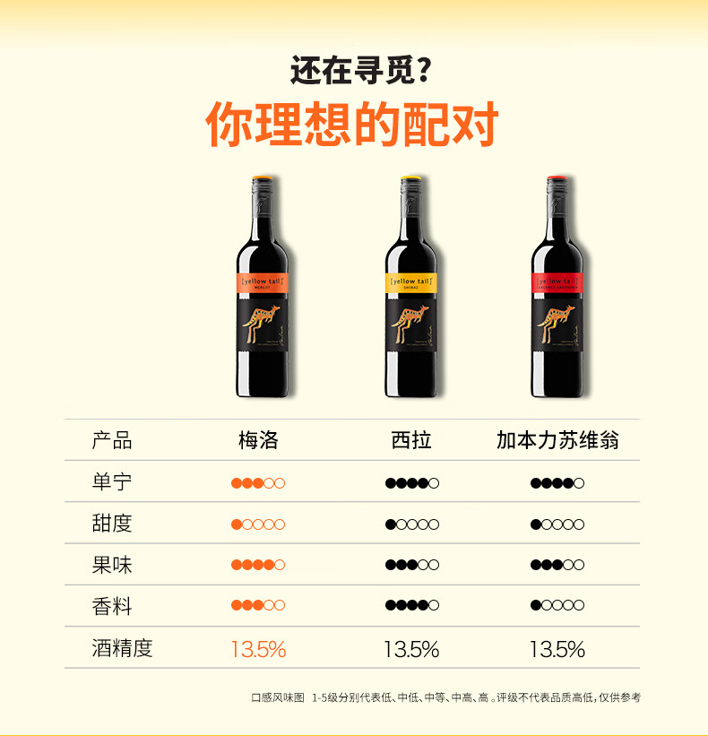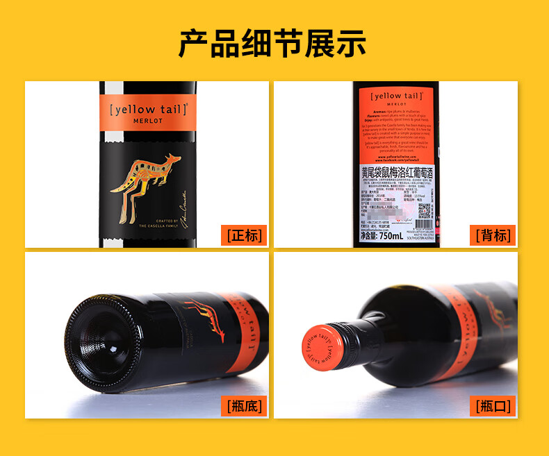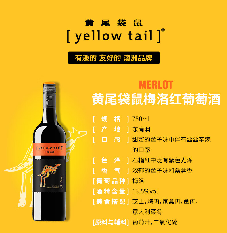 颜色:砖红色;口感:柔和;特性:普通餐酒;国产/进口:进口;适用场景:家庭聚会,派对活动;包装:整箱装;酸度:低酸;类别:红葡萄酒;葡萄品种:梅洛(Merlot);类型:静止酒;香型:花香,果香;产地:澳大利亚;容量:750mL;甜度:半干型;系列:普通系列;保质期:详见实物酒标;酒精度:13.5%vol;原产地:澳大利亚;存储方法:避光、卧放或倒放、常温贮藏;容量:750ml;产品重量:7.28kg;包装清单:黄尾袋鼠梅洛红葡萄酒整箱 750ml*6瓶;