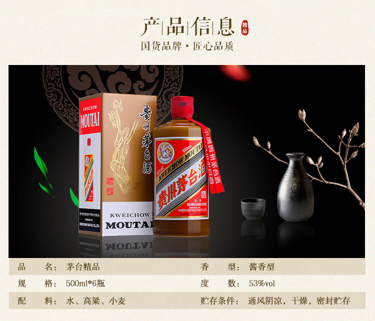 包装:整箱装;容量:500-749mL;香型:酱香型;产地:贵州;度数:50度及以上;酒精度:53%vol;容量:500ml;产品重量:3000g;包装清单:茅台 飞天 精品 53度 500ml*6 整箱装 酱香型白酒*1;