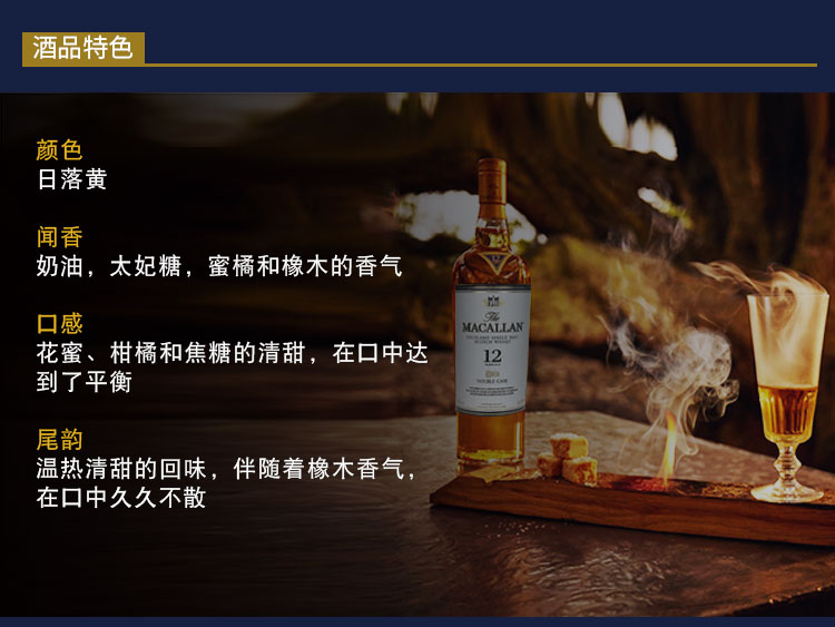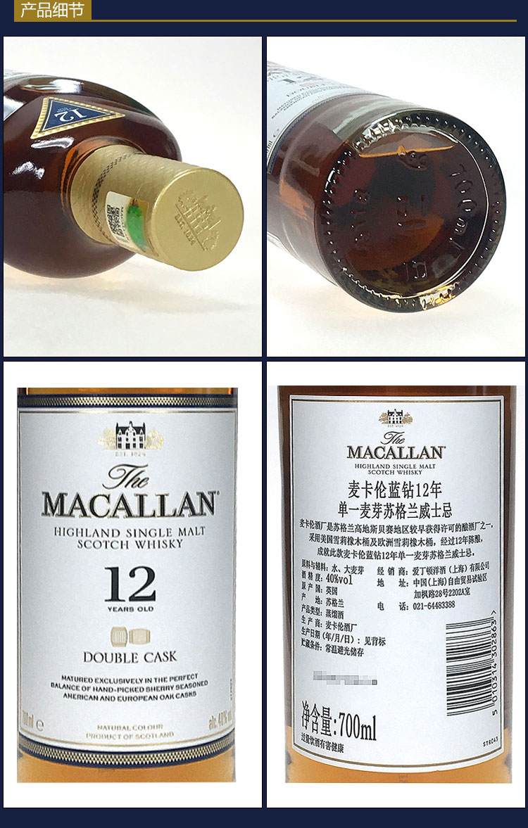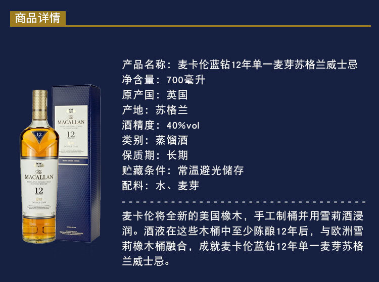 类型:单一麦芽威士忌;产地:苏格兰;适用场景:自斟自饮,亲友馈赠,家庭聚会,商务宴请;包装:瓶装;容量:700-999mL;阶段:小白入门;原料:水、麦芽;保质期:无;酒精度:40%vol;存储方法:常温避光保存;产品重量:1.5kg;容量:700mL;包装清单:麦卡伦(MACALLAN)洋酒 12年蓝钻单一麦芽苏格兰威士忌700ml *1;