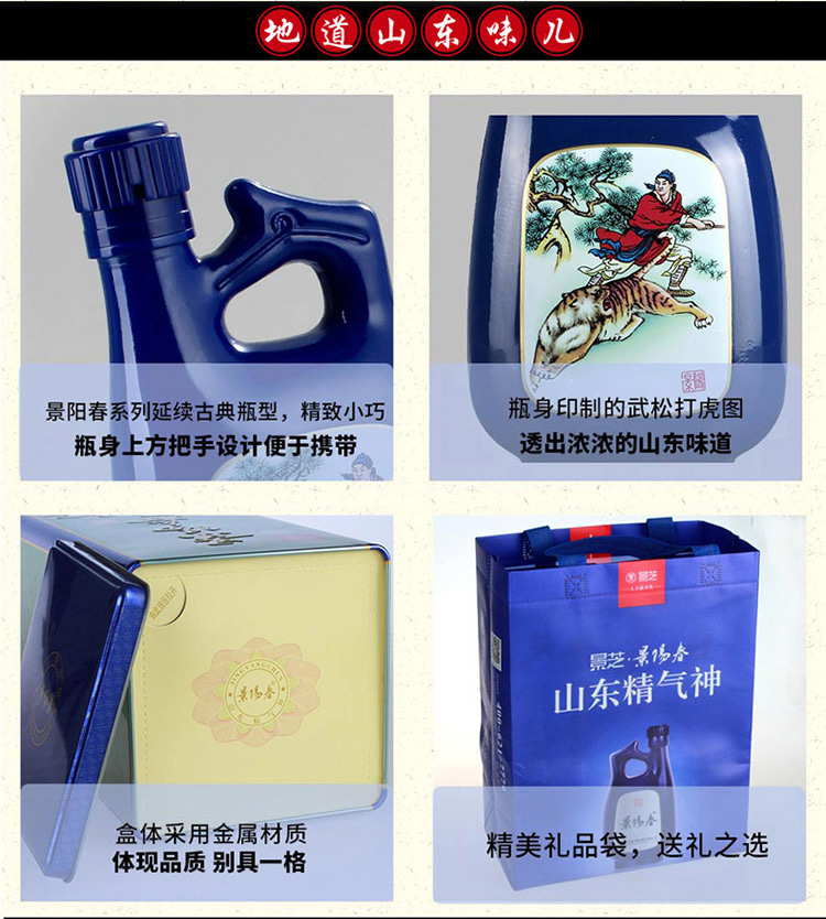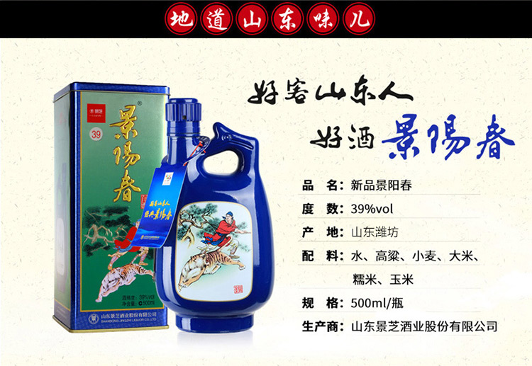 包装:整箱装;容量:500-749mL;香型:浓香型;产地:山东;度数:35-39度;酒精度:39%vol;容量:500ml;产品重量:9000g;包装清单:景芝 白酒 景阳春 39度 500ml*6瓶 整箱装 *1;