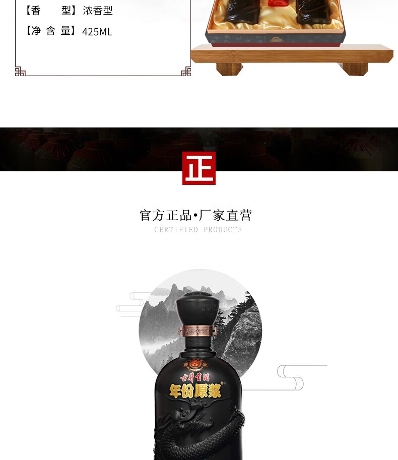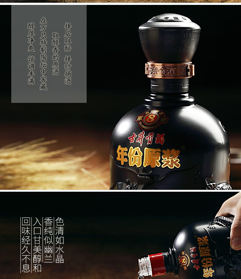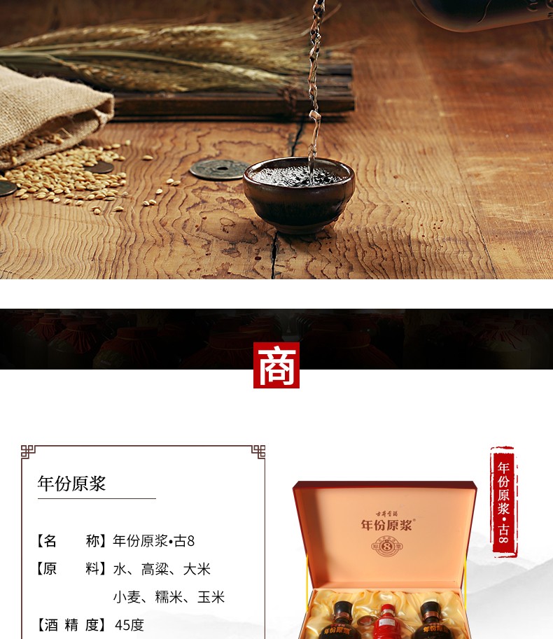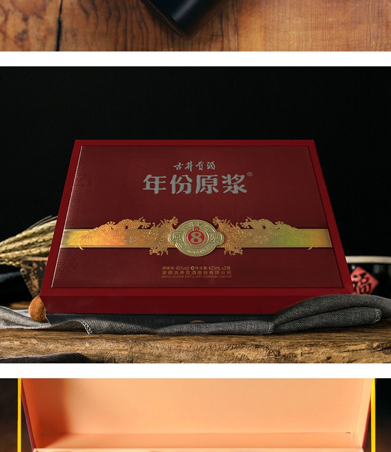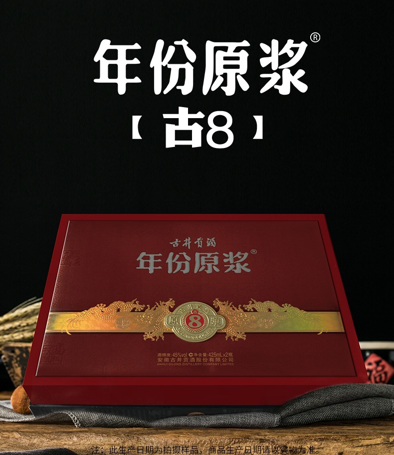 包装:礼盒装;容量:376-499mL;香型:浓香型;产地:安徽;度数:40-49度;酒精度:45%vol;容量:0;产品重量:3615g;包装清单:古井贡酒 年份原浆 古8 45度425ml*2瓶 浓香型白酒礼盒装;