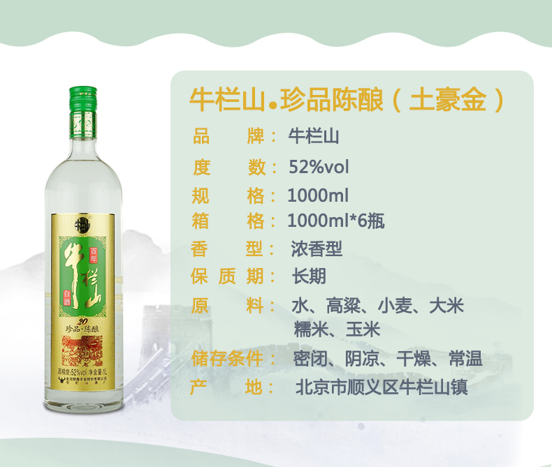 包装:整箱装;容量:750mL及以上;香型:浓香型;度数:50度及以上;香型:浓香型;产地:北京;酒精度:52;包装:整箱装;产品重量:1800g;容量:1000ml;包装清单:牛栏山 白酒 浓香型 二锅头 珍品陈酿(20)土豪金 52度 1000ml*6瓶 整箱装;