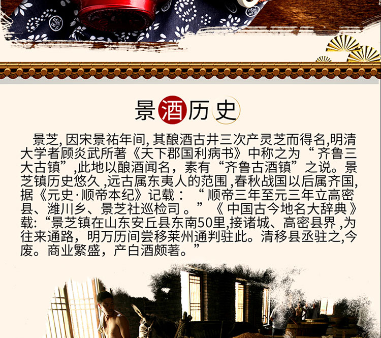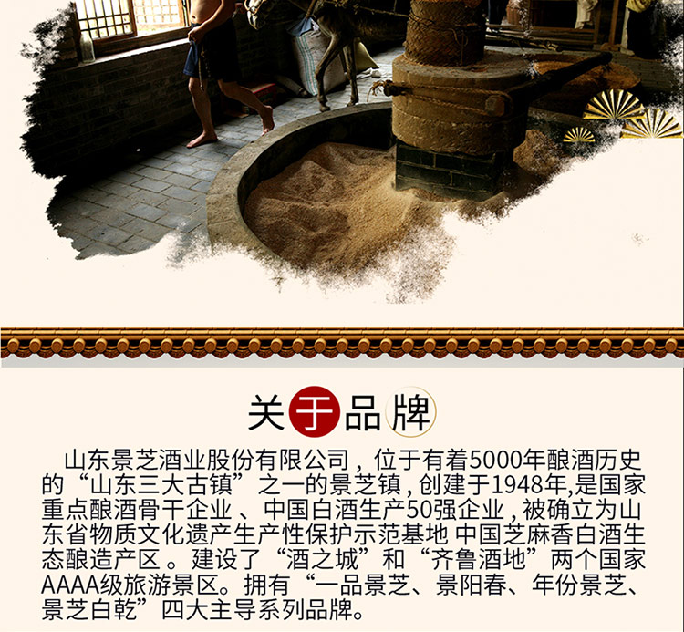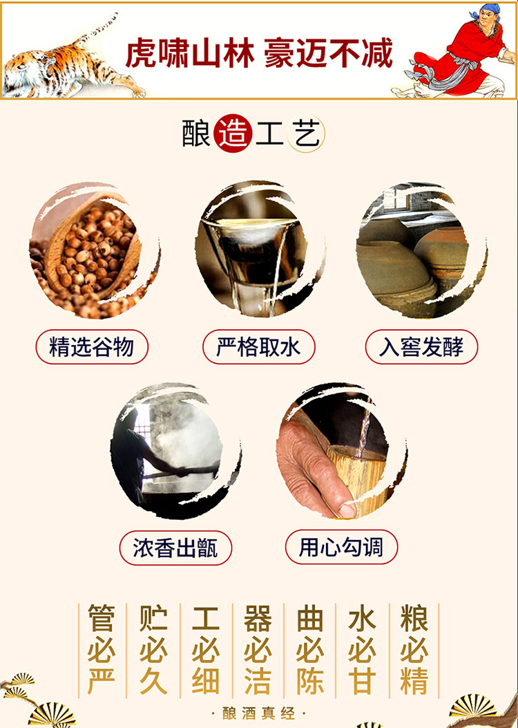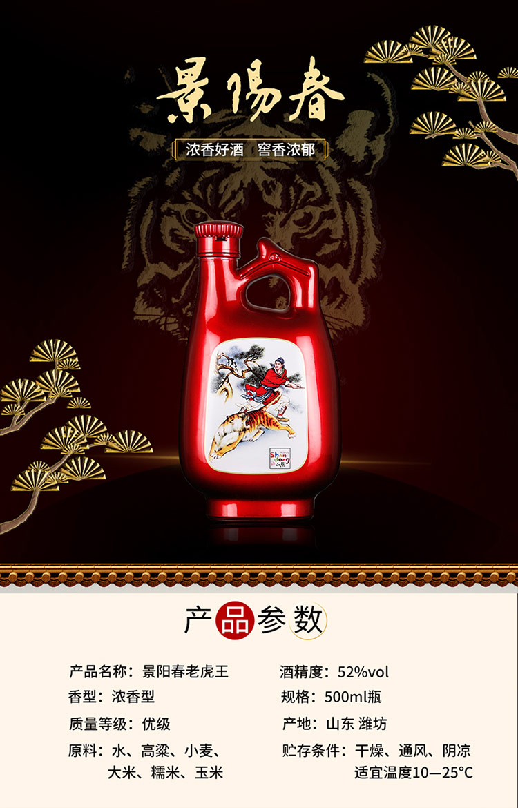 包装:整箱装;容量:500-749mL;香型:浓香型;产地:山东;度数:50度及以上;酒精度:52%vol;容量:500ml;产品重量:9000g;包装清单:景芝 白酒 景阳春 52度 老虎王 500ml*6瓶 整箱装*1;