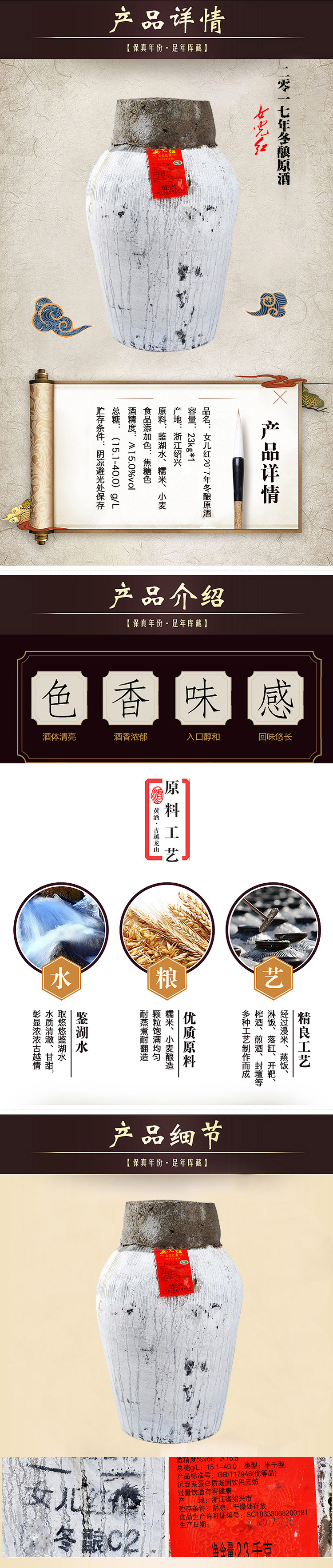 口味:半干型黄酒(总糖:15.0-40.0g/L);度数:10-19度;产地:浙江;适用场景:商务宴请,礼节拜访,家庭聚会,收藏,朋友小聚,婚宴用酒,自斟自饮;包装:坛装;容量:5L以上;保质期:无;酒精度:15;存储方法:阴凉避光处;容量:23000mL;产品重量:30kg;包装清单:23kg*1坛;