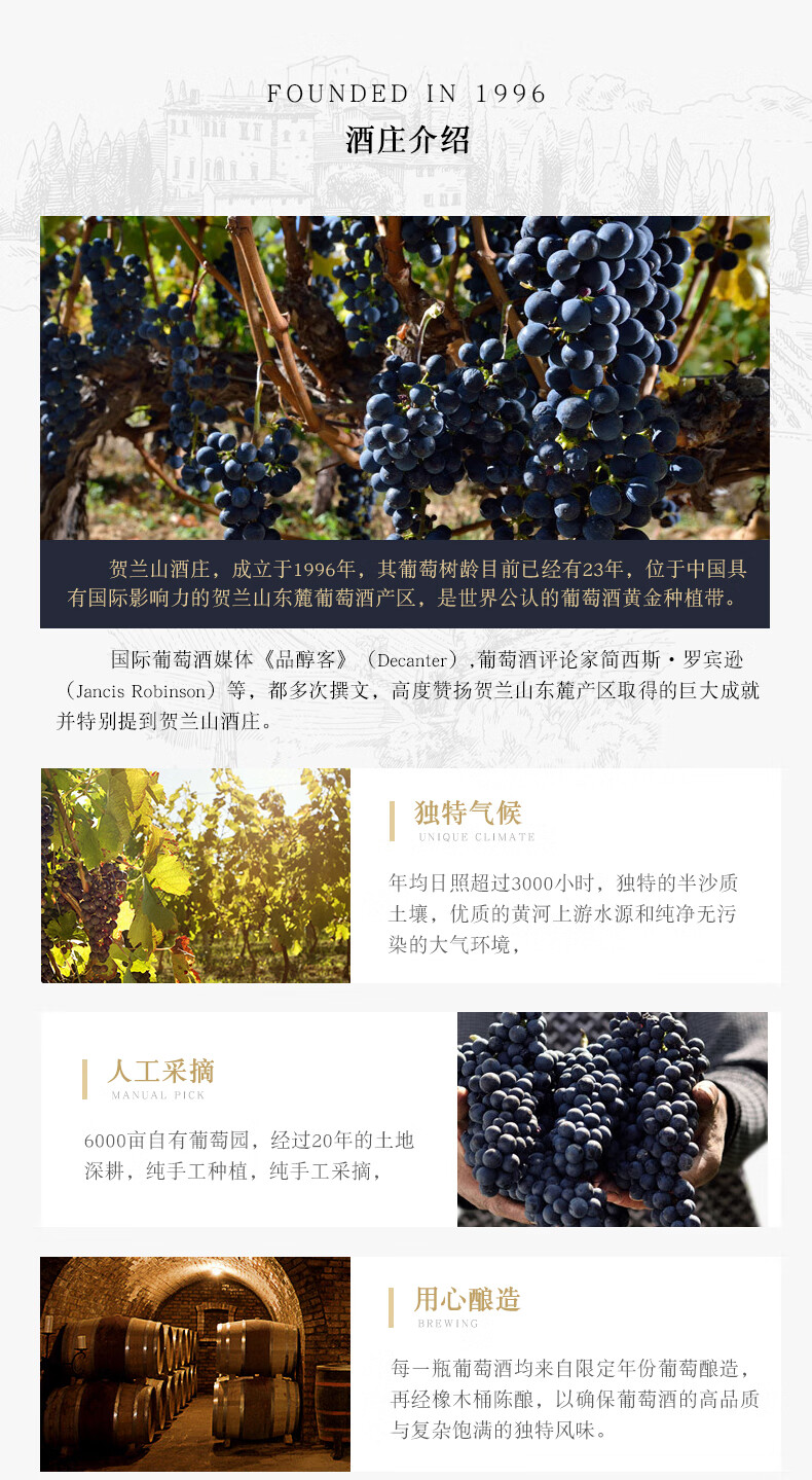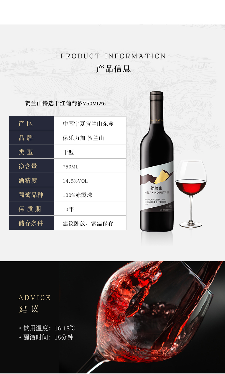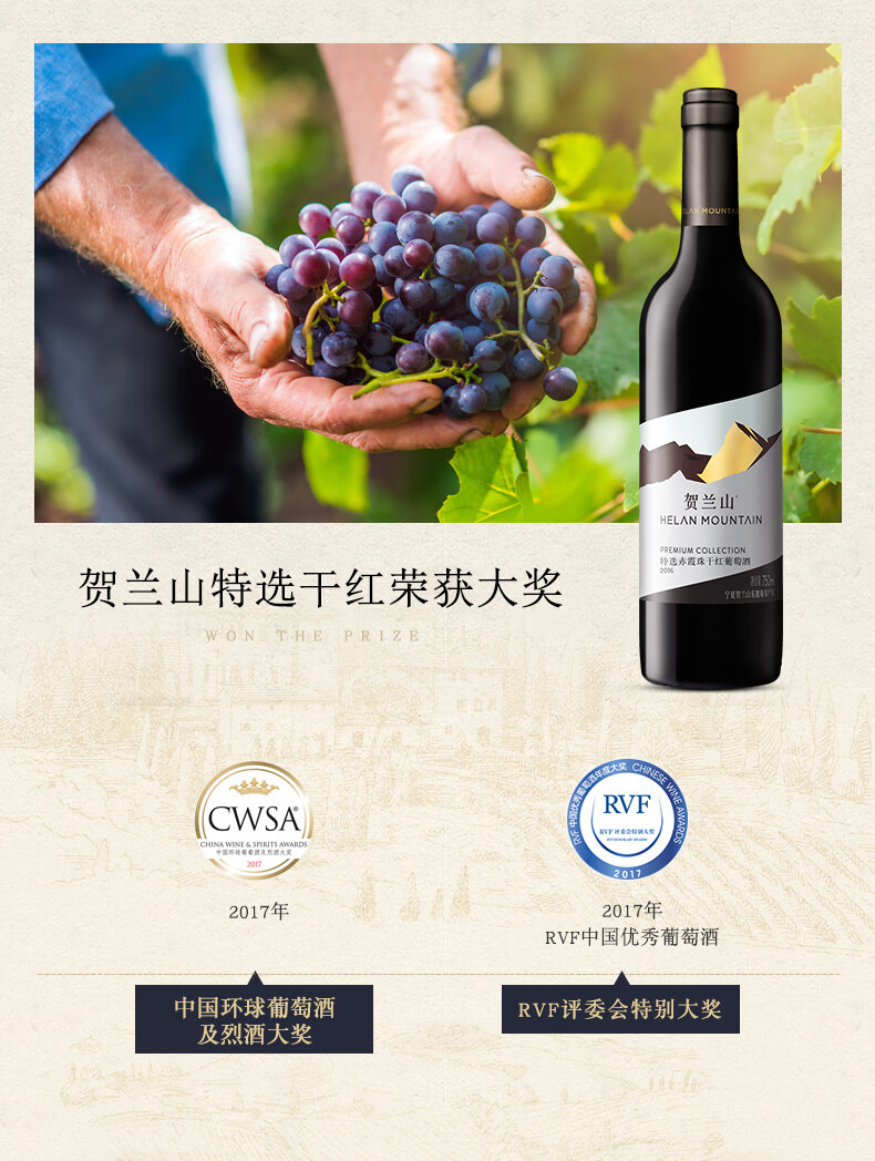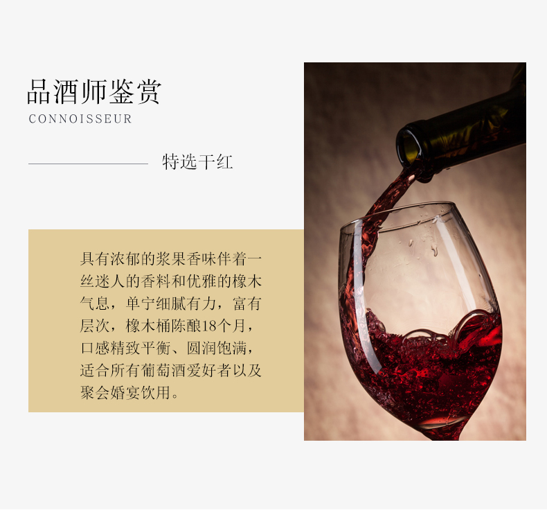 采摘年份:2016年;口感:饱满;特性:列级庄;国产/进口:国产;产地:中国大陆;适用场景:礼节拜访,商务宴请,婚礼婚宴,派对活动;包装:整箱装;酸度:中酸;容量:750mL;甜度:干型;类别:红葡萄酒;葡萄品种:赤霞珠(Cabernet Sauvignon);系列:特选系列;保质期:无;酒精度:14.5%vol;原产地:中国大陆;存储方法:恒温10-18度、避光、通风;容量:750ml;产品重量:7.6kg;包装清单:特选干红750ML*6瓶;