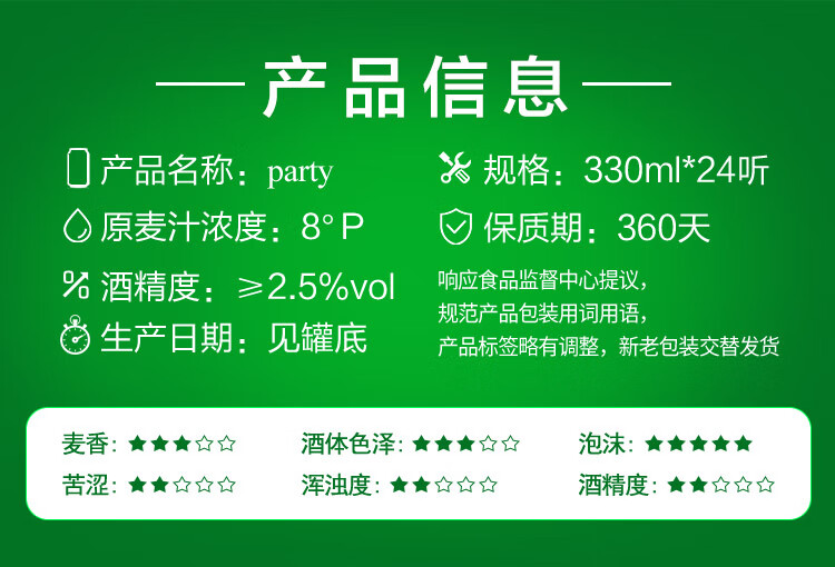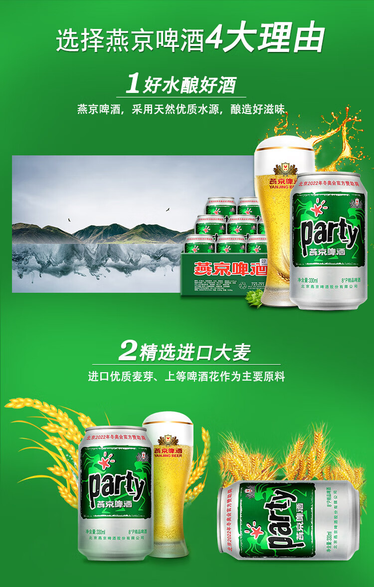 国产/进口:国产;产地:中国大陆;适用场景:礼节拜访,家庭聚会,自斟自饮,情侣约会,烧烤撸串,派对必备,酒吧夜店;包装:听装;容量:330mL;类别:黄啤酒;原料:水、麦芽、大米、啤酒花;保质期:360天;酒精度:≥2.5%vol;原产地:中国大陆;原麦汁浓度:8°P;存储方法:5℃-25℃避光贮存;容量:330ml;产品重量:8.50kg;包装清单:燕京啤酒 8度 party啤酒330ml*24听整箱装 口感清爽;