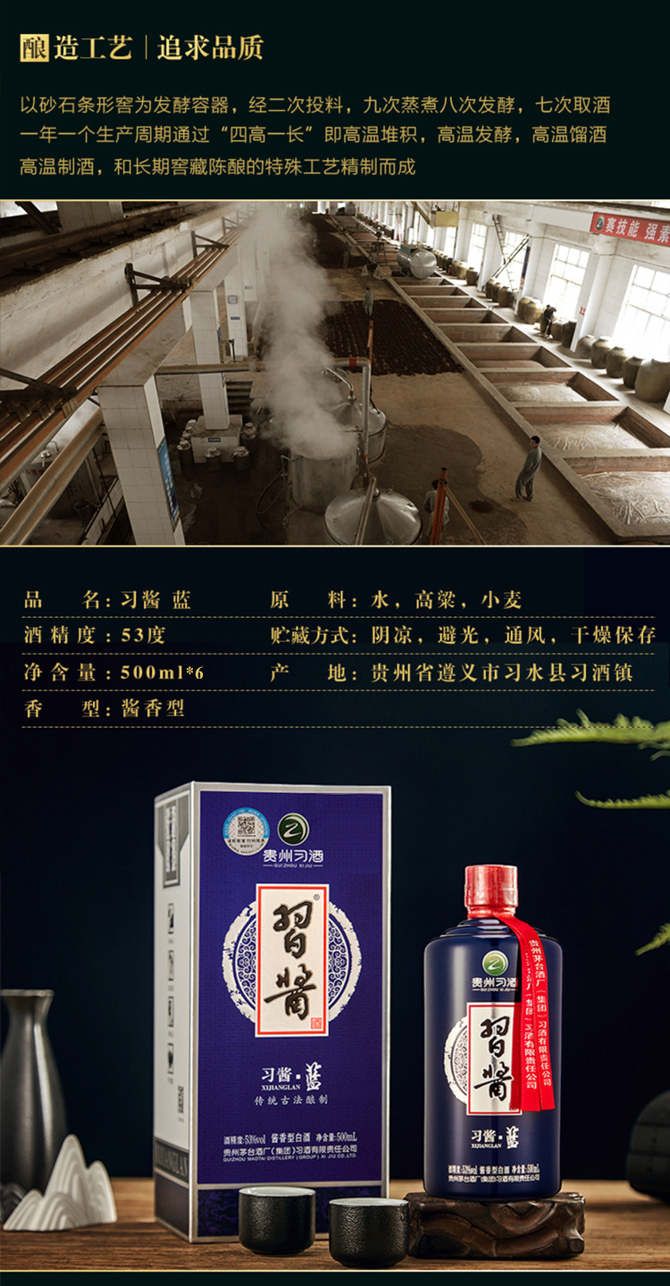 包装:整箱装;容量:500-749mL;香型:酱香型;产地:贵州;度数:50度及以上;酒精度:53%vol;容量:3000ml;产品重量:8.41g;包装清单:习酒 蓝习酱 53度500ml*6瓶 整箱装*1;