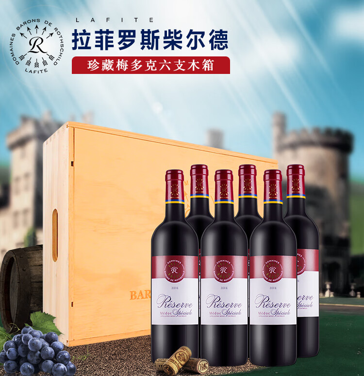 颜色:宝石红;口感:饱满;特性:法定产区酒(AOC/AOP等);国产/进口:进口;适用场景:商务宴请,家庭聚会;包装:整箱装;酸度:中酸;类别:红葡萄酒;葡萄品种:其它;类型:静止酒;香型:果香;产地:法国;容量:750mL;甜度:干型;保质期:见背标;酒精度:详见实物背标;原产地:法国;存储方法:避光、卧放;容量:750mL;产品重量:9.27kg;包装清单:拉菲珍藏梅多克干红葡萄酒 750ml*6 六支装松木礼盒*1;