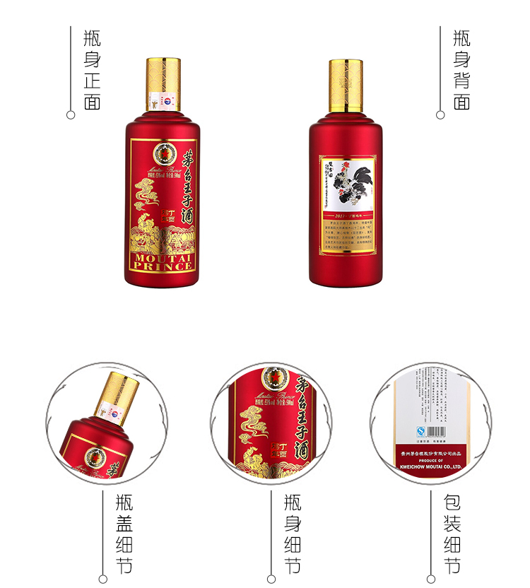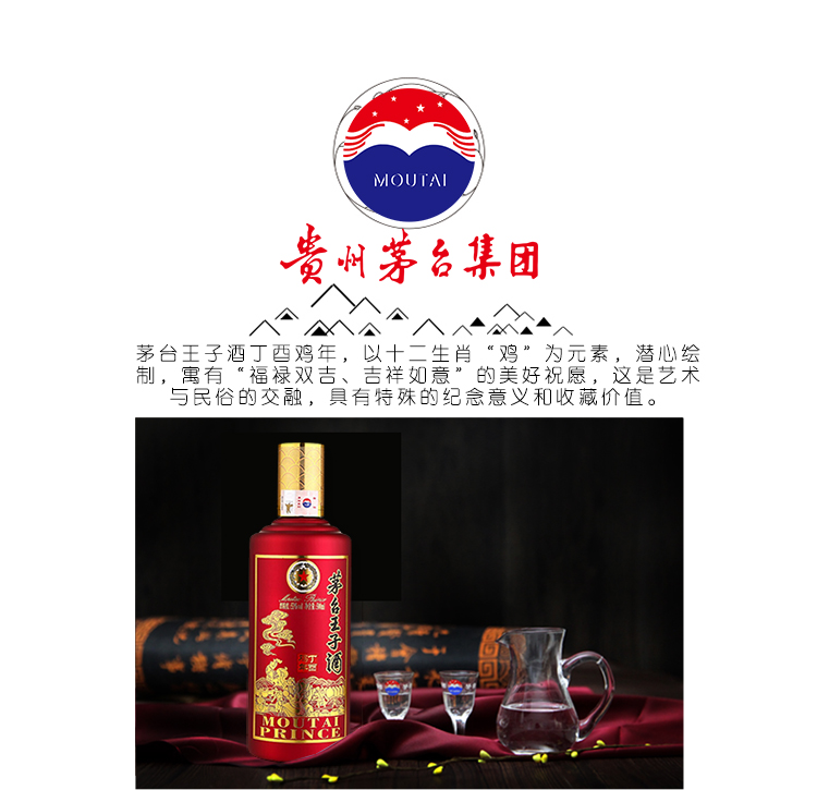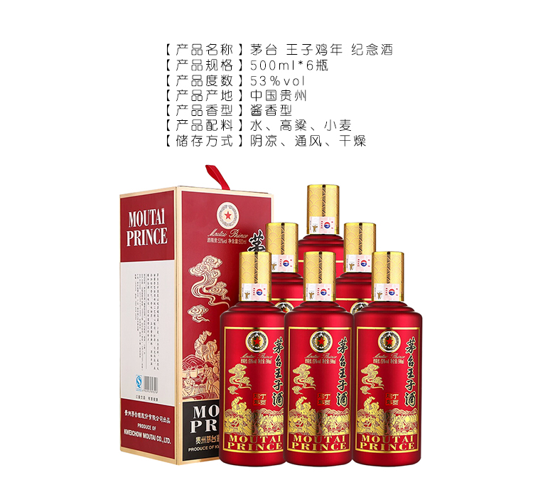 包装:整箱装;容量:500-749mL;香型:酱香型;产地:贵州;度数:50度及以上;酒精度:53%vol;容量:500mL*6瓶;产品重量:7200g;包装清单:茅台 王子鸡年 纪念酒 53度 500ml*6瓶 整箱装;