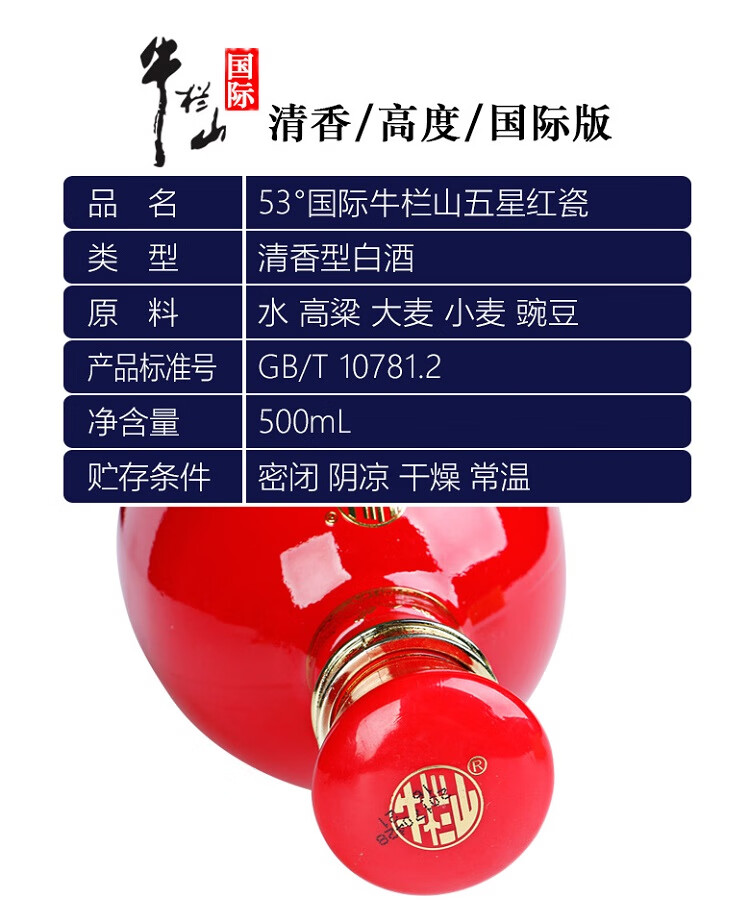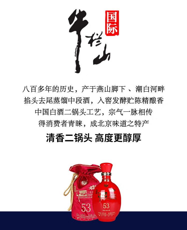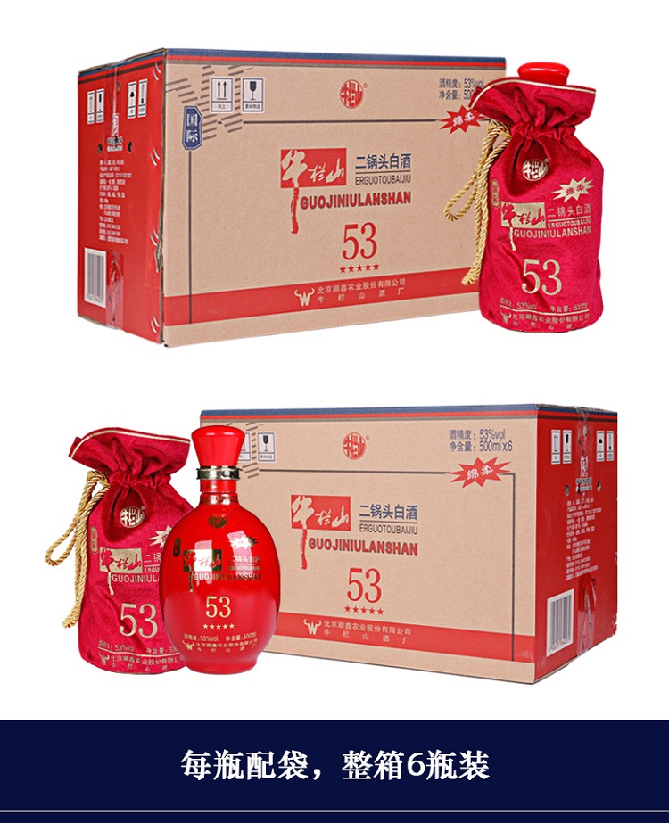 包装:整箱装;容量:500-749mL;香型:清香型;产地:北京;度数:50度及以上;酒精度:53%vol;容量:500ml*6;产品重量:6800g;包装清单:53度国际牛栏山二锅头红瓷整箱 x 1;