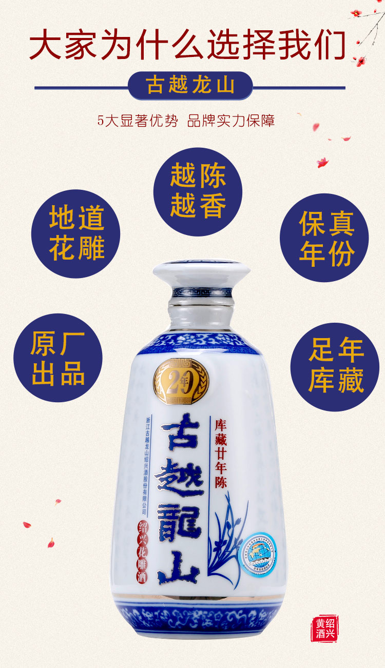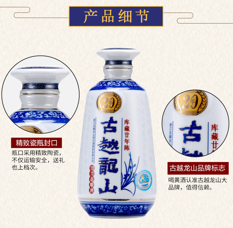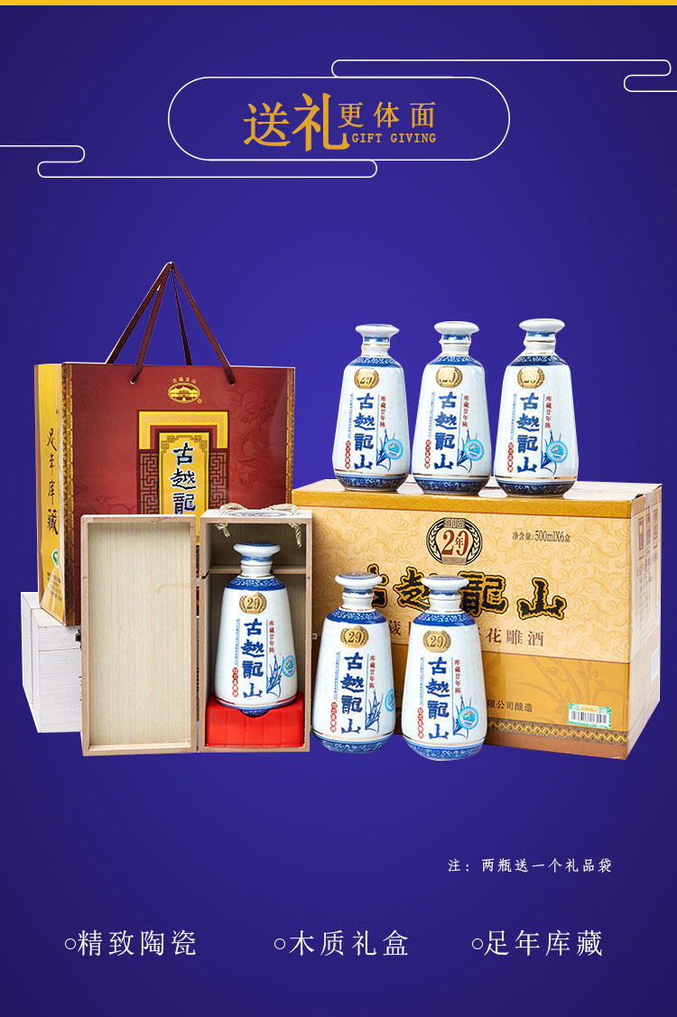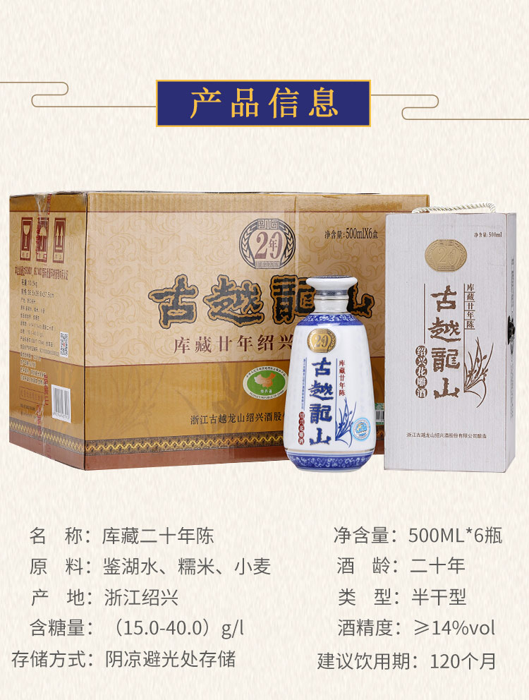 口味:半干型黄酒(总糖:15.0-40.0g/L);度数:10-19度;产地:浙江;适用场景:商务宴请,礼节拜访,家庭聚会,朋友小聚,自斟自饮;包装:整箱装;容量:500mL以下;保质期:120个月;酒精度:14;存储方法:阴凉处避光保存;容量:3000mL;产品重量:3kg;包装清单:古越龙山 绍兴黄酒 库藏二十年陈 半干型 木盒装 花雕酒 500ml*6瓶 整箱装;