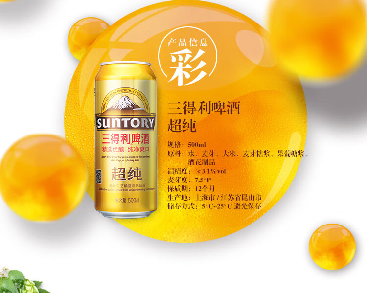 国产/进口:国产;产地:中国大陆;适用场景:家庭聚会,自斟自饮,烧烤撸串,酒吧夜店;包装:听装;容量:500mL;类别:黄啤酒;原料:水、麦芽、大米、麦芽糖浆、果葡糖浆、酒花制品;系列:超纯;保质期:12个月;酒精度:≥3.1%vol;原产地:中国大陆;原麦汁浓度:7.5°P;存储方法:5°C~25°C避光保存;产品重量:12.73kg;容量:500ml;包装清单:三得利(Suntory)超纯500ml×24听整箱 一箱;