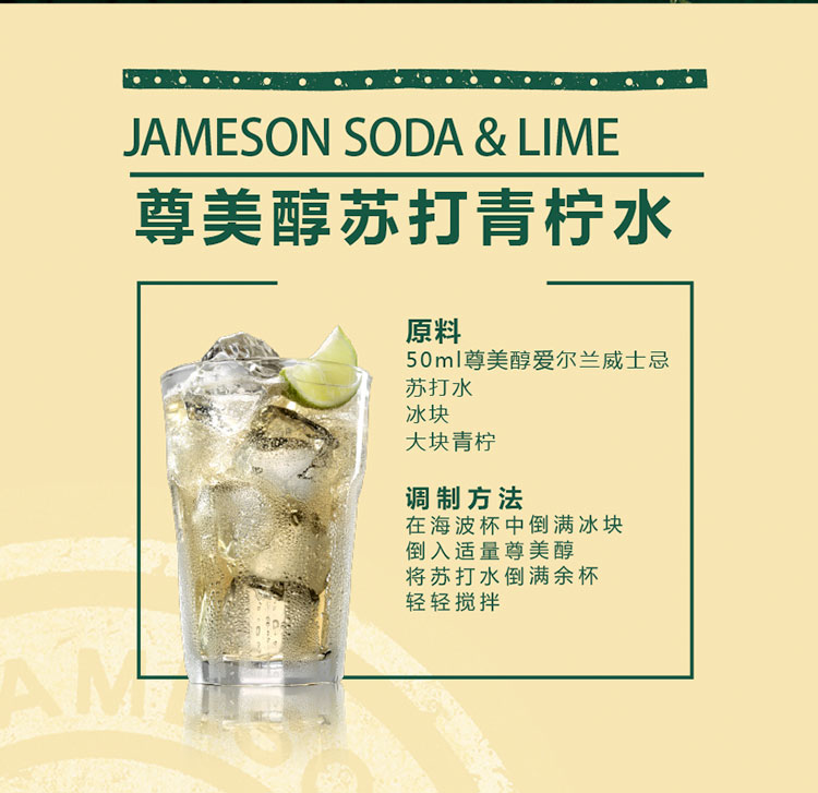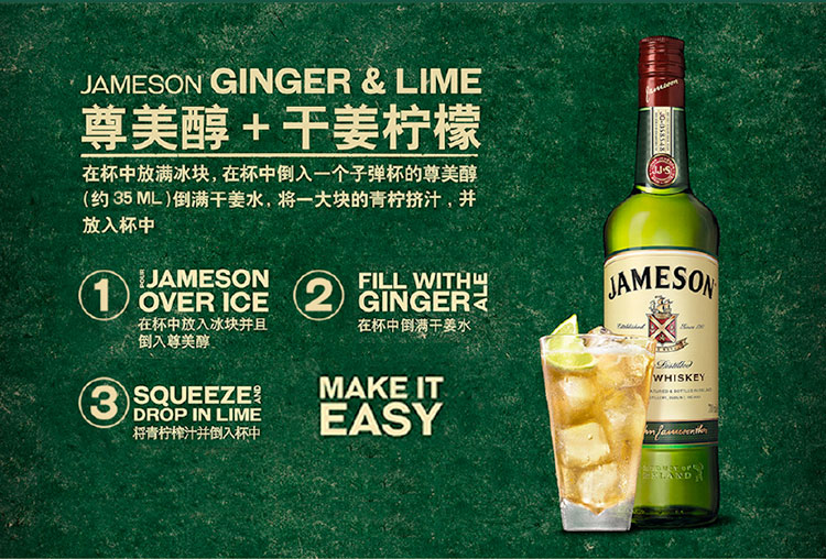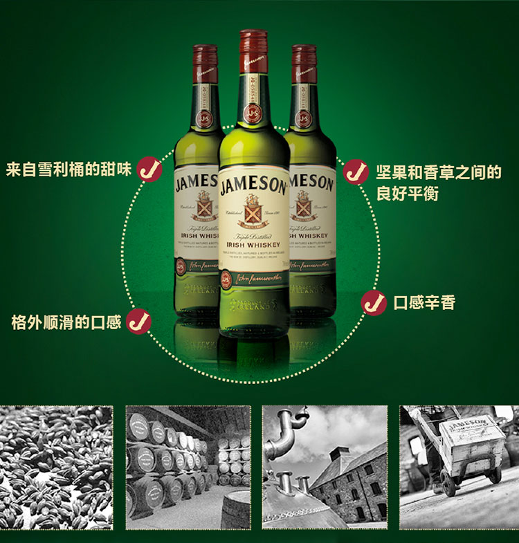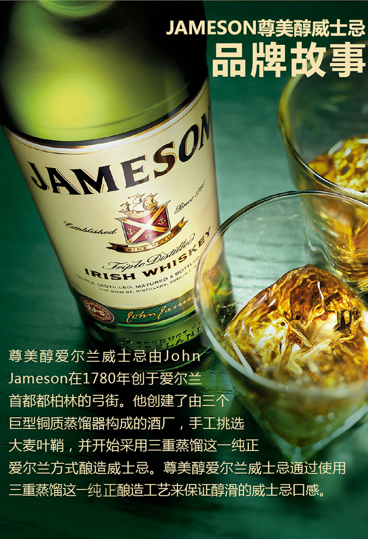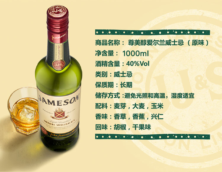 类型:调和威士忌;产地:苏格兰;适用场景:自斟自饮,亲友馈赠,家庭聚会,商务宴请,情侣约会,闺蜜私语;包装:瓶装;容量:1L及以上;阶段:挑剔味蕾;酒精度:40%vol;原料:水、麦芽、焦糖色;保质期:无;存储方法:常温避光;容量:1000ml;产品重量(kg):1.55;包装清单:尊美醇(Jameson)洋酒 爱尔兰 威士忌 1000ml(1L)*1;