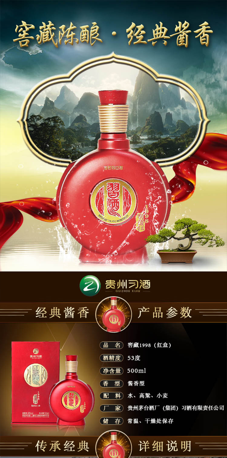 包装:瓶装;容量:500-749mL;香型:酱香型;产地:贵州;度数:50度及以上;酒精度:53%vol;容量:500ml;产品重量:1.45g;包装清单:茅台集团 习酒 窖藏1998(红盒) 53度 单瓶装白酒500ml × 1;
