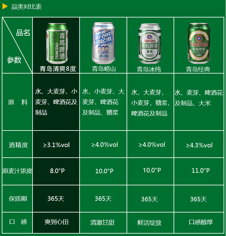 国产/进口:国产;产地:中国大陆;适用场景:家庭聚会,礼节拜访,情侣约会,自斟自饮,派对必备,烧烤撸串,酒吧夜店;包装:听装;容量:330mL;类别:黄啤酒;原料:水、大麦芽、小麦芽、糖浆、啤酒花及制品;国产/进口:国产;保质期:365天;酒精度:≥3.1%vol;原产地:中国大陆;原麦汁浓度:8.0°P;存储方法:避光贮存,禁止加热或0℃以下冷冻;类别:黄啤酒;包装:听装;产品重量(kg):8.54kg;容量:330ml;包装清单:青岛啤酒(TsingTao)清爽8度330ml*24听 整箱装 欢聚时刻 畅饮佳品;