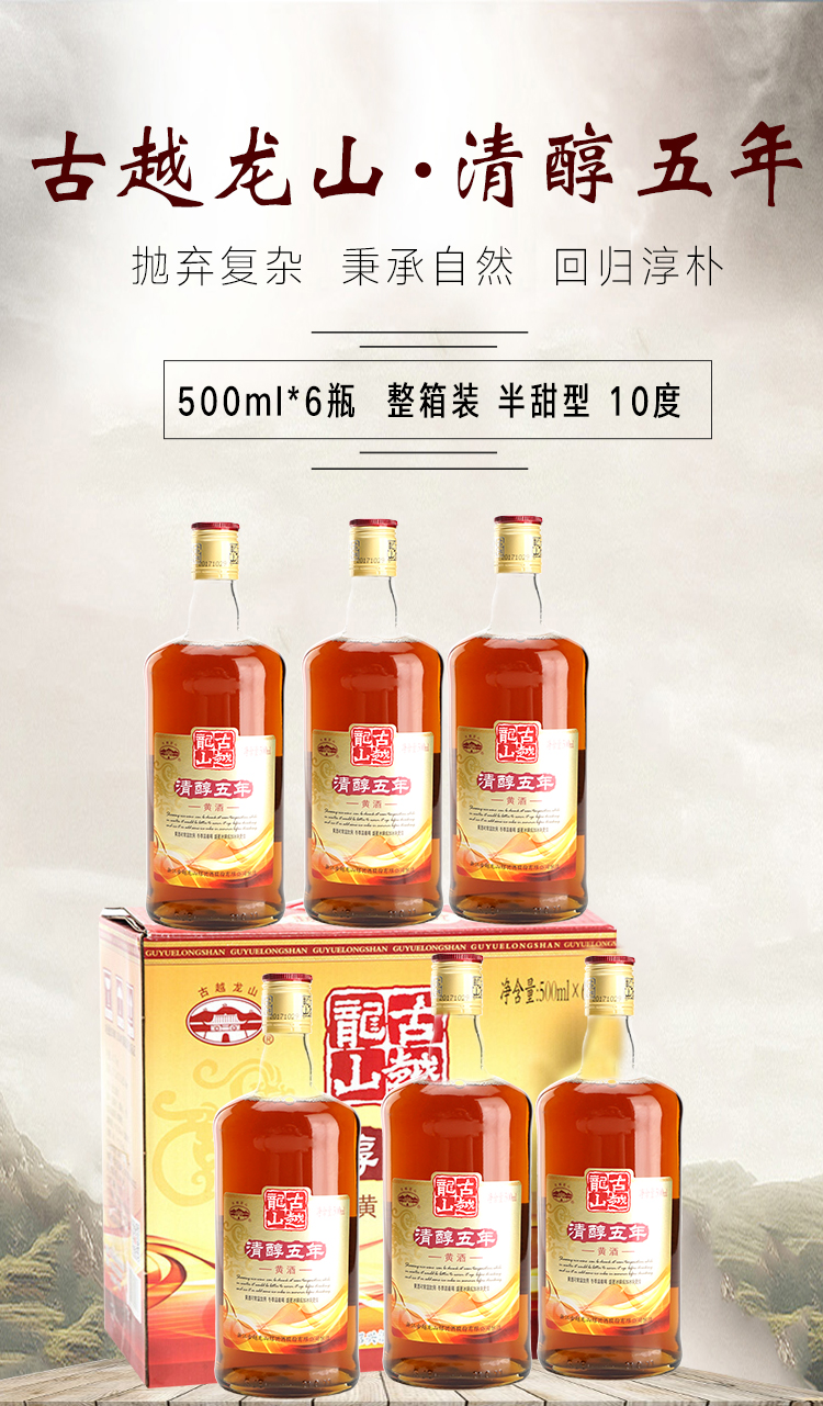 口味:半甜型黄酒(总糖:40.0-100.0g/L);度数:10-19度;产地:浙江;适用场景:家庭聚会,礼节拜访,商务宴请,自斟自饮,朋友小聚;包装:整箱装;容量:500-999mL;保质期:1825天;酒精度:14;存储方法:阴凉避光处保存;容量:500mL;产品重量:6.3kg;包装清单:古越龙山 绍兴黄酒 清醇五年 500ml*6瓶 整箱装;