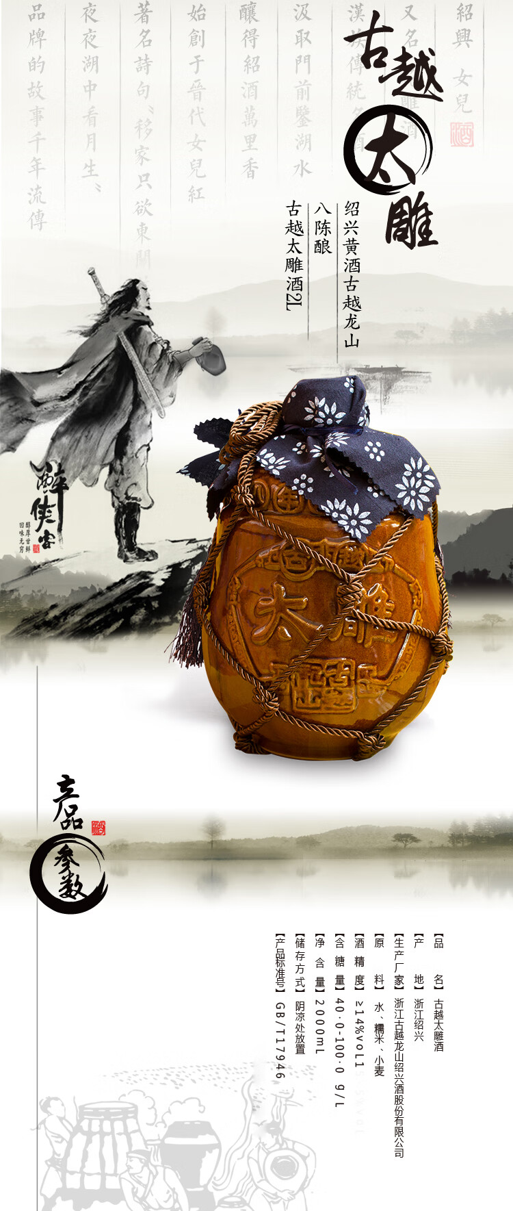 口味:半甜型黄酒(总糖:40.0-100.0g/L);度数:10-19度;产地:浙江;适用场景:家庭聚会,礼节拜访,商务宴请,自斟自饮,朋友小聚;包装:坛装;容量:1-5L;保质期:1080;酒精度:14;存储方法:阴凉避光处保存;容量:2000mL;产品重量:6.6kg;包装清单:无;