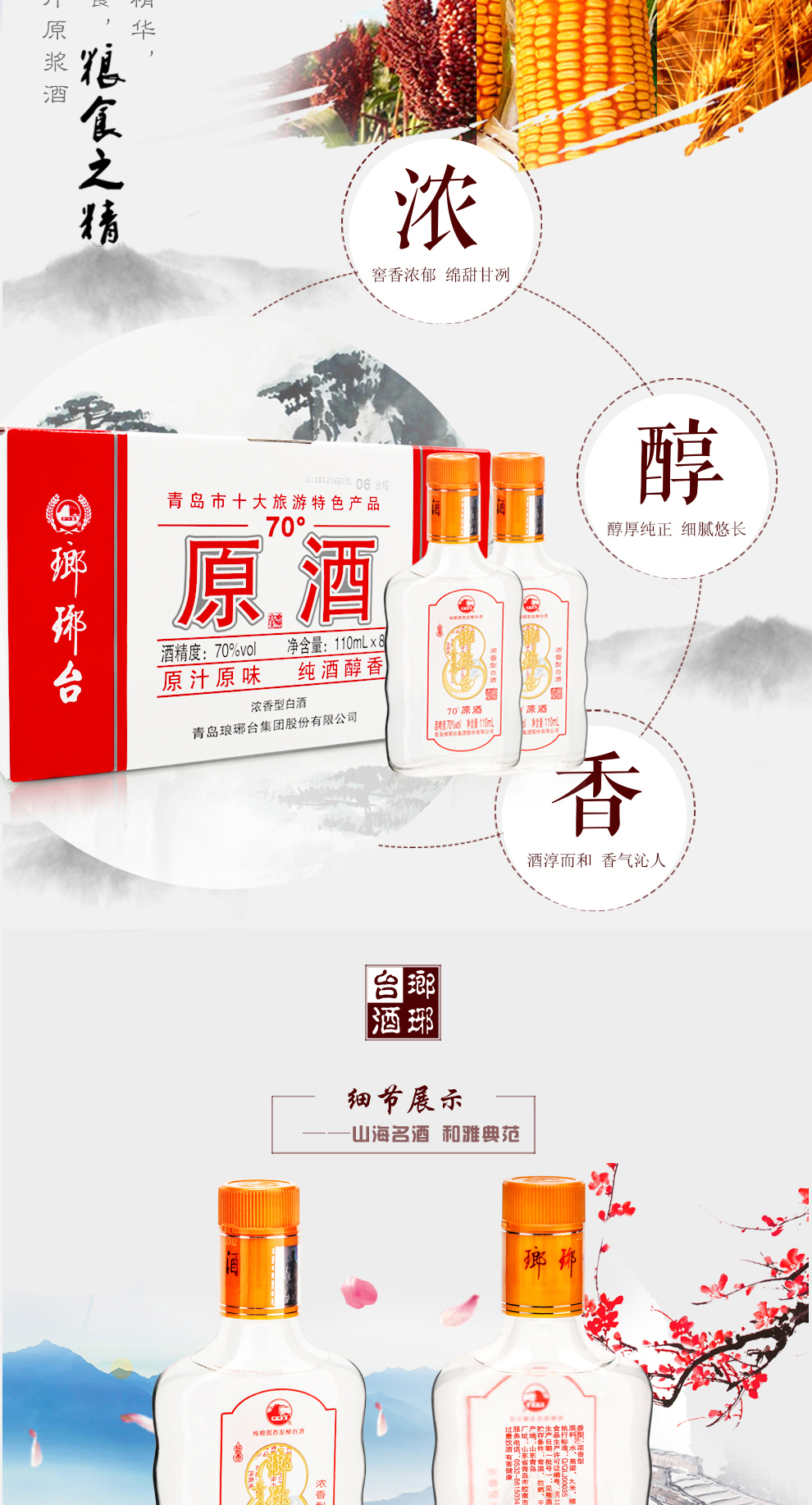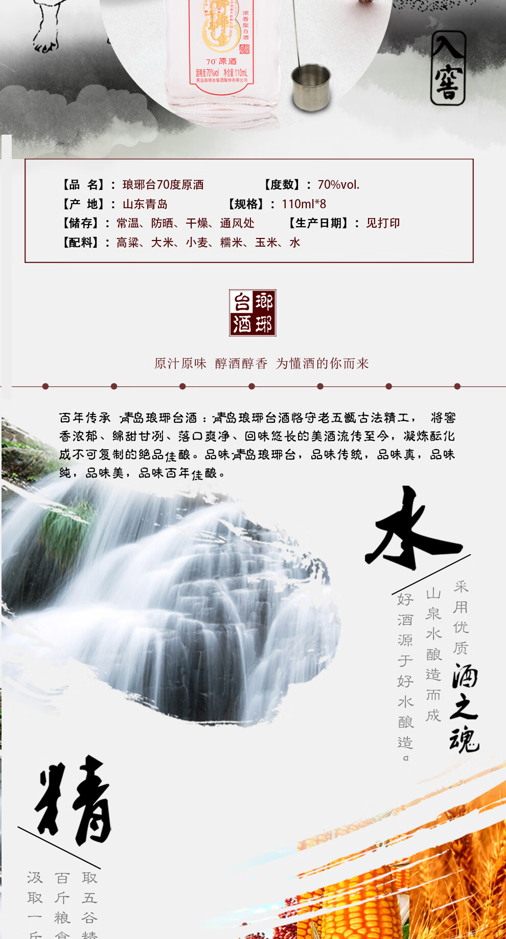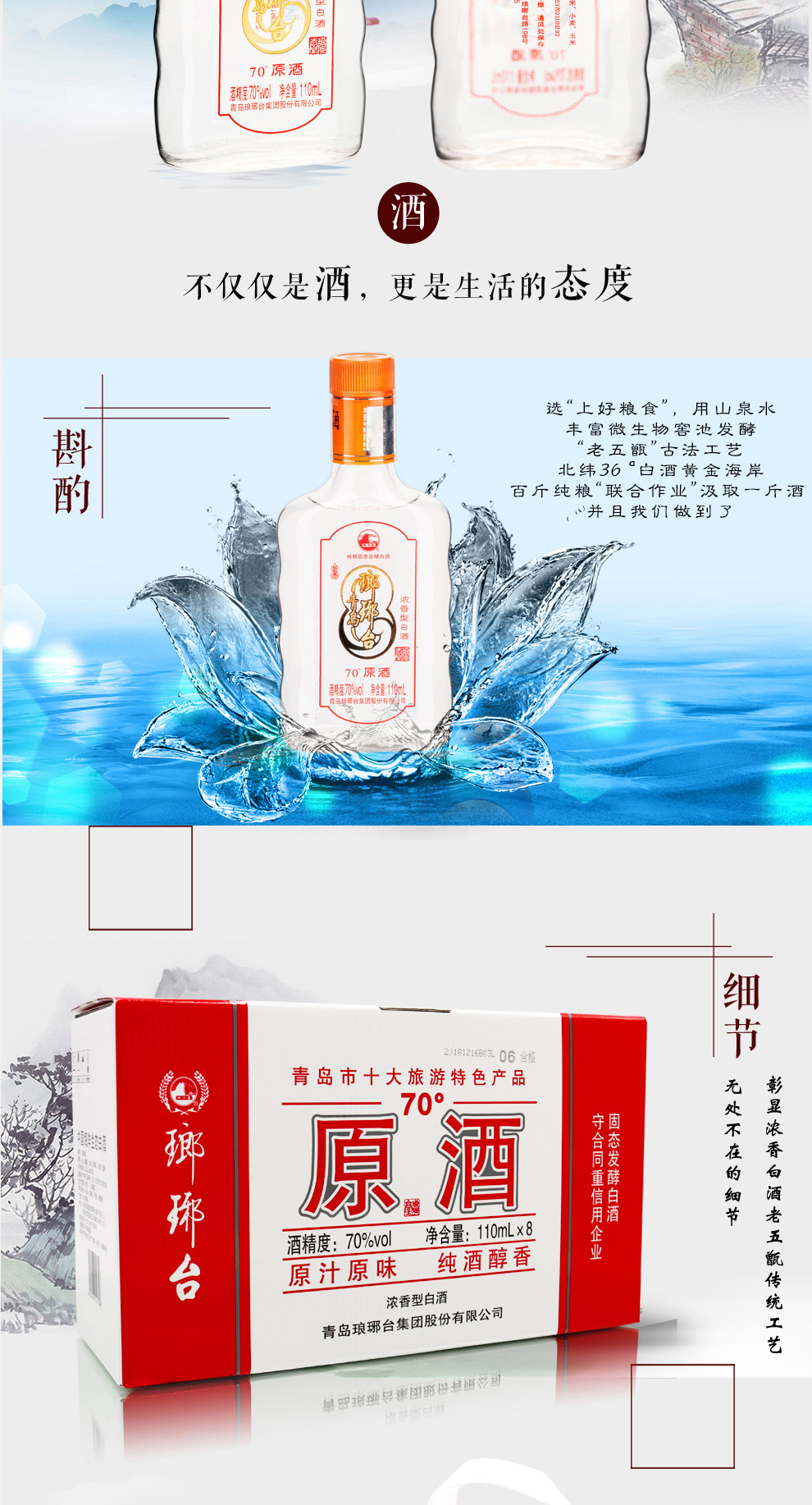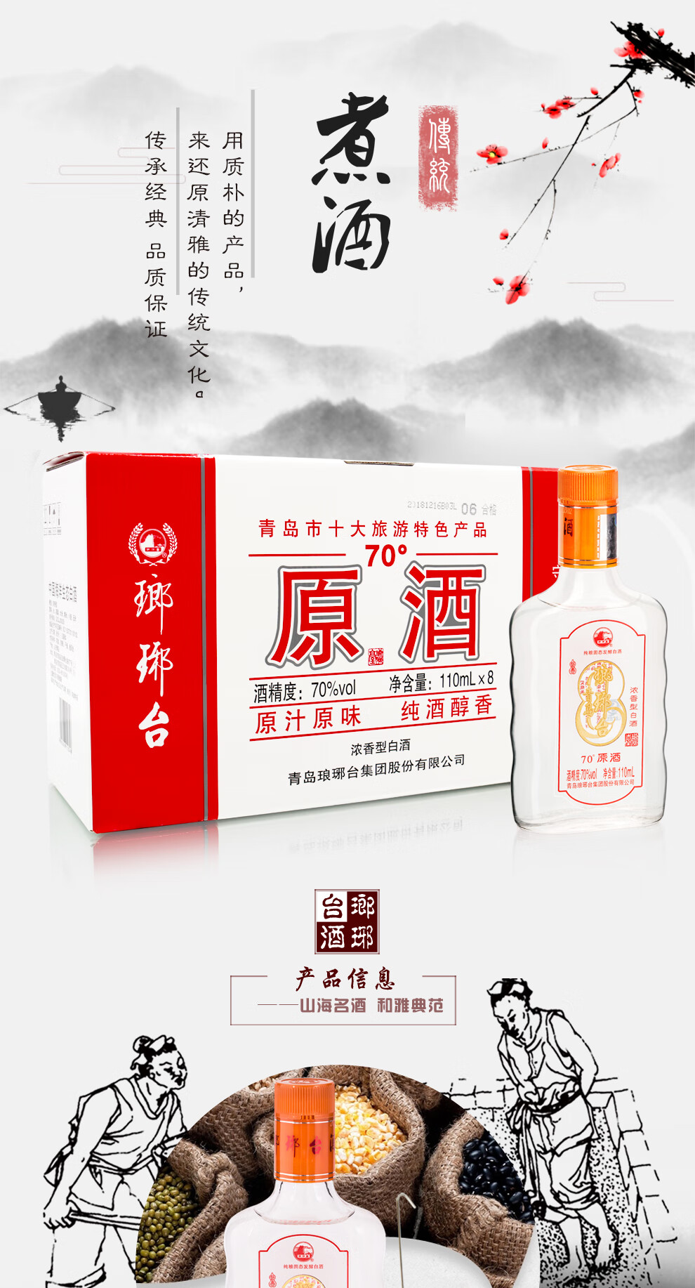 包装:整箱装;容量:375mL及以下;香型:浓香型;度数:50度以上;容量:110ml;产品重量(kg):2.376kg;包装:整箱;存储方法:常温、阴凉、通风、干燥处;酒精度:70%vol.;香型:浓香型;等级:优级;省份:山东;包装清单:琅琊台 原酒礼盒 原浆酒 70度 110ml*8瓶 礼盒 整箱装 *1;