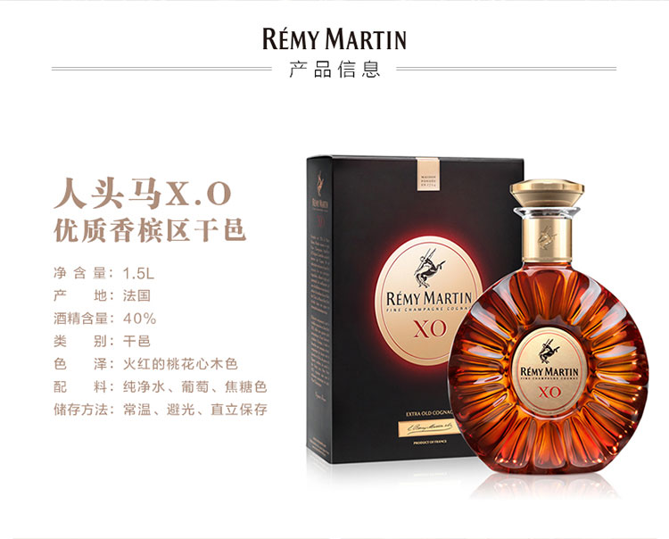 特性:XO;国产/进口:进口;产地:法国;适用场景:家庭聚会,商务宴请,情侣约会,自斟自饮,亲友馈赠,闺蜜私语;包装:瓶装;容量:1L及以上;原料:葡萄,水,焦糖色;产地:法国;特性:XO;保质期:无保质期;酒精度:40%vol;存储方法:常温避光保存;包装:瓶装;容量:1500mL;产品重量:3.5kg;包装清单:人头马(Remy Martin)洋酒 天醇XO特优香槟干邑白兰地 1500mlx1;