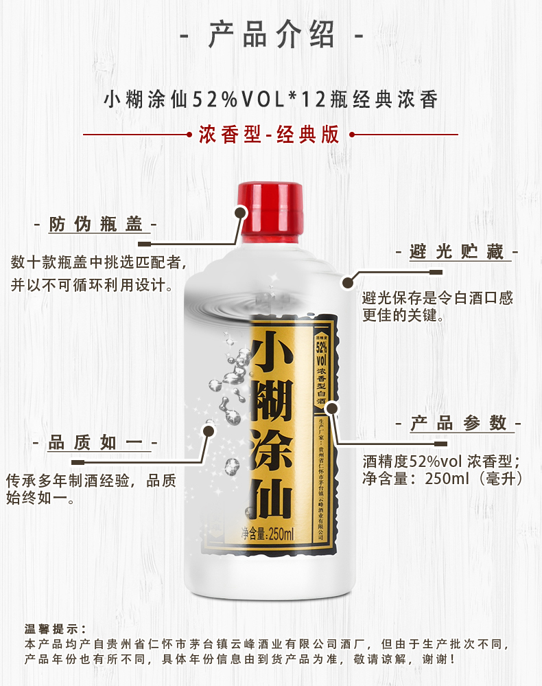 包装:整箱装;容量:375mL及以下;香型:浓香型;产地:贵州;度数:50度及以上;酒精度:52%vol;容量:250;产品重量:7305g;包装清单:小糊涂仙 浓香型白酒 52度 250ml*12瓶 整箱装;