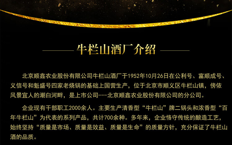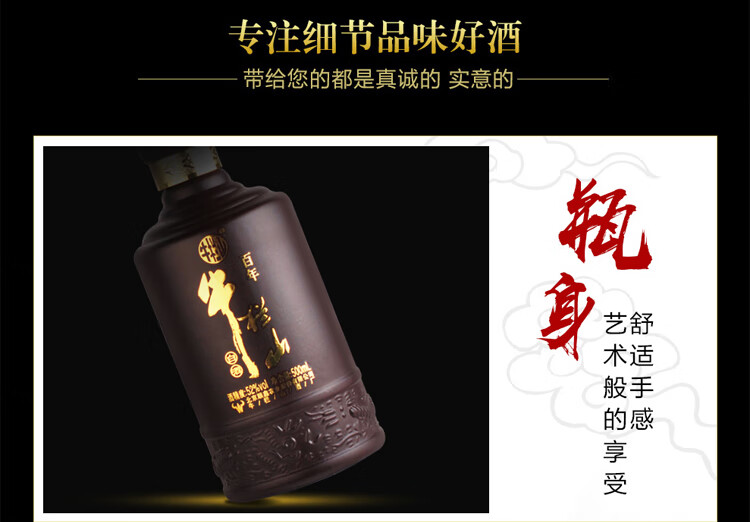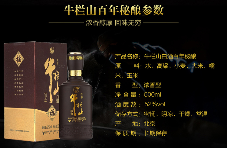包装:整箱装;容量:500-749mL;香型:浓香型;产地:北京;度数:50度及以上;酒精度:52%vol;容量:500ml;产品重量:500g;包装清单:牛栏山 百年秘酿 52度白酒 500ml*6瓶 整箱装*1;