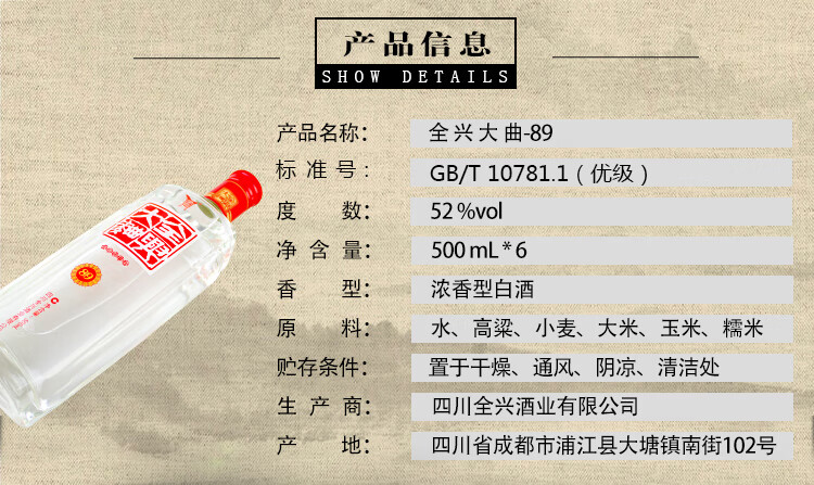 包装:整箱装;容量:376-499mL;香型:浓香型;产地:四川;度数:50度及以上;酒精度:52%vol;容量:500ml*6;产品重量:8000g;包装清单:500ml*6瓶;