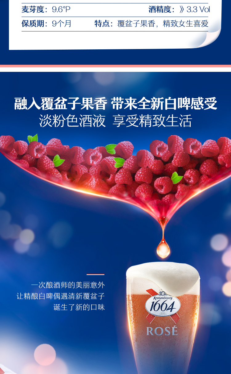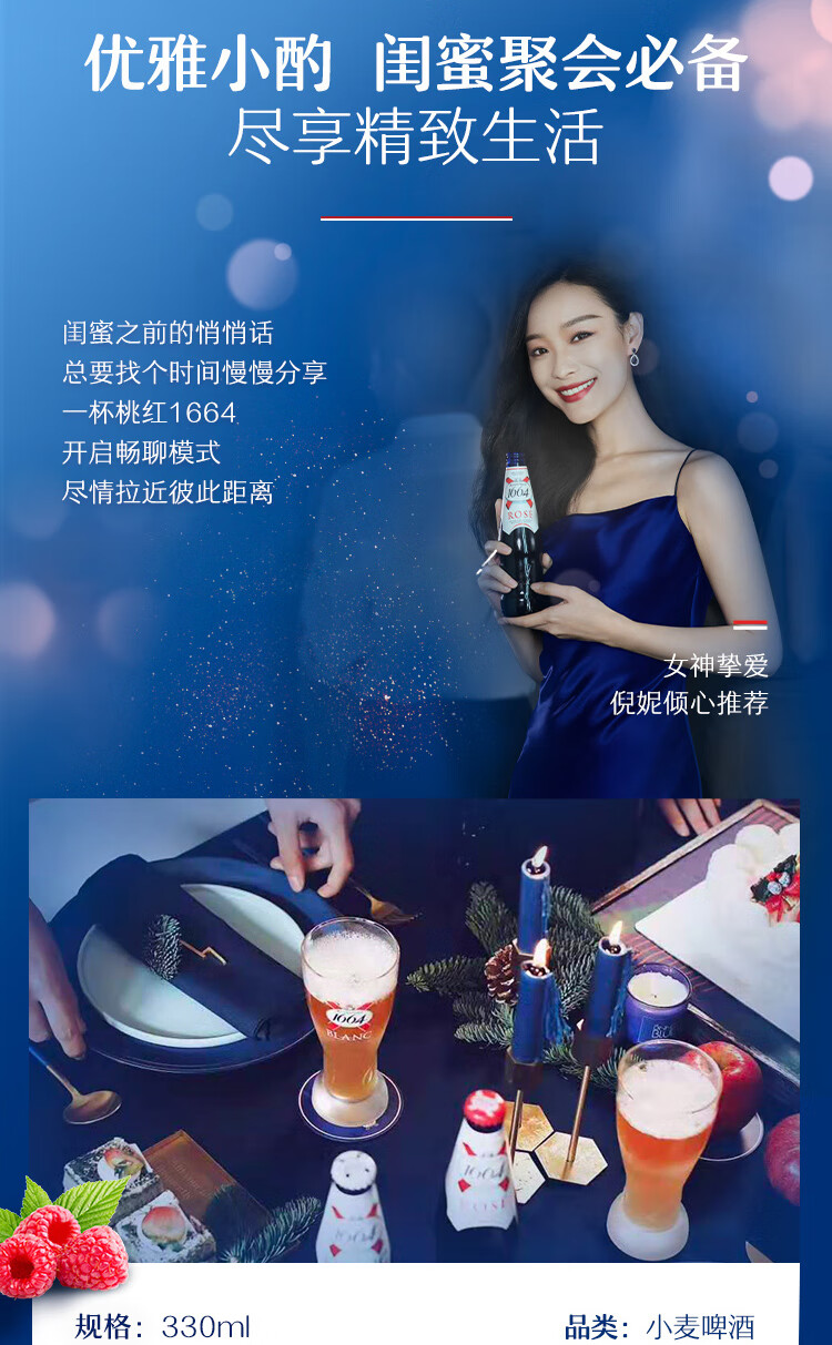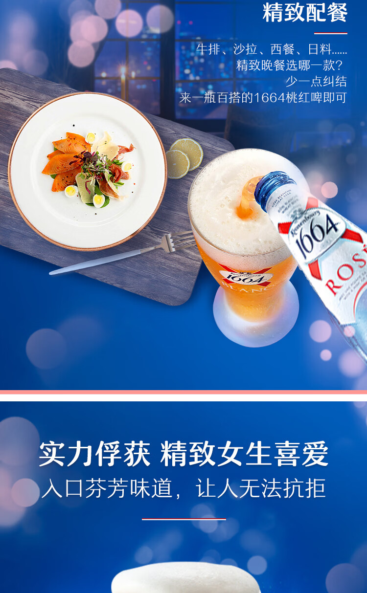 适用场景:家庭聚会;包装:瓶装;容量:330mL;类别:白啤酒;国产/进口:国产;产地:中国大陆;原料:水、麦芽、小麦、果葡糖浆、白砂糖、食用香精、柠檬酸、复合浓缩汁(胡萝卜、黑加仑)、酒花;保质期:9个月;酒精度:≥3.3%vol;原产地:中国大陆;原麦汁浓度:11.8;存储方法:阴凉避光储存;容量:330;产品重量:5.72kg;包装清单:1664啤酒 桃红啤酒 330ml*24瓶;