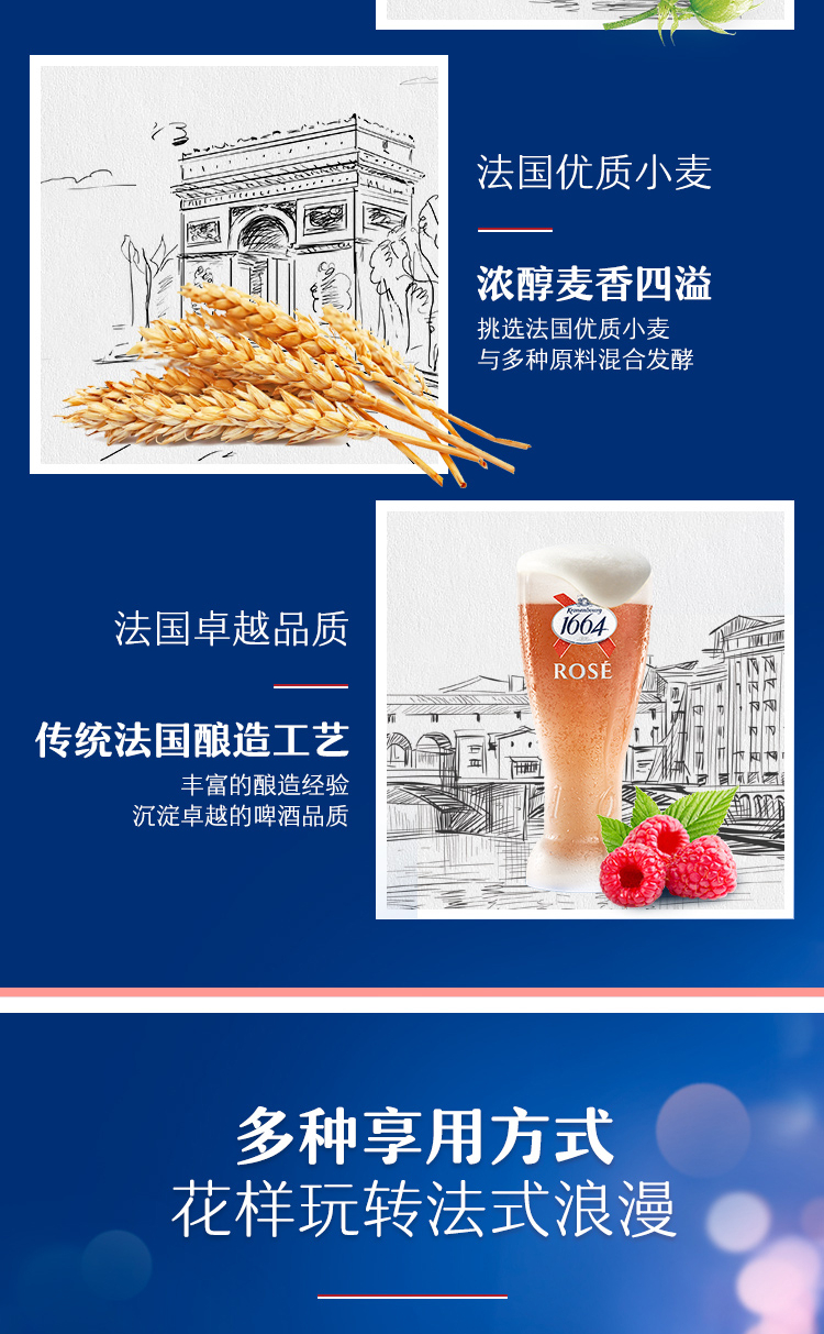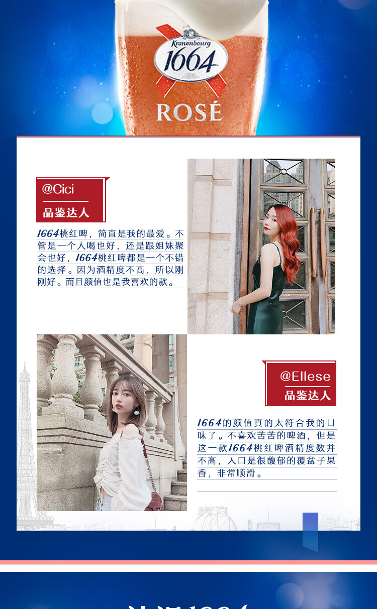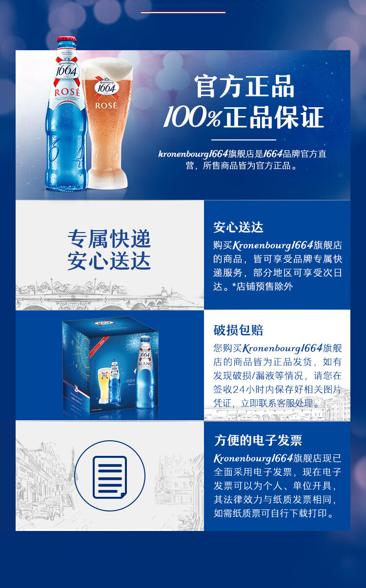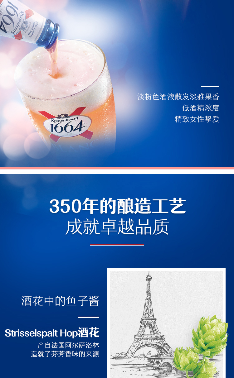 适用场景:家庭聚会;包装:瓶装;容量:330mL;类别:白啤酒;国产/进口:国产;产地:中国大陆;原料:水、麦芽、小麦、果葡糖浆、白砂糖、食用香精、柠檬酸、复合浓缩汁(胡萝卜、黑加仑)、酒花;保质期:9个月;酒精度:≥3.3%vol;原产地:中国大陆;原麦汁浓度:11.8;存储方法:阴凉避光储存;容量:330;产品重量:5.72kg;包装清单:1664啤酒 桃红啤酒 330ml*24瓶;