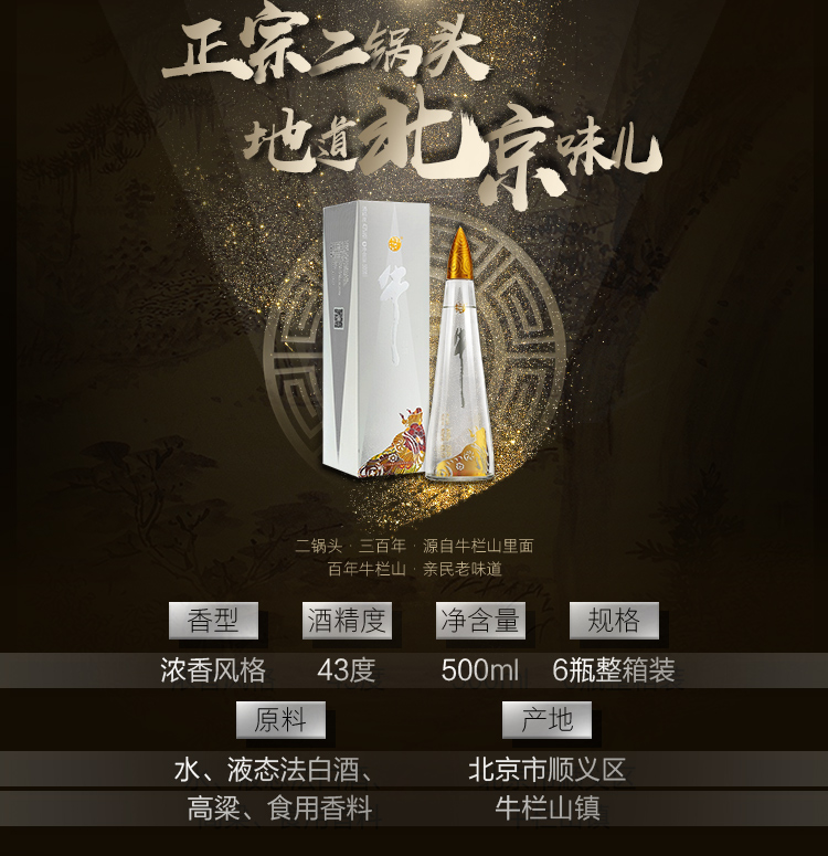 包装:整箱装;容量:500-749mL;香型:浓香型;产地:北京;度数:40-49度;酒精度:43%vol;容量:500ml;产品重量:6928g;包装清单:牛栏山 牛角尖 43度 500ml*6瓶 整箱装 浓香风格白酒(内含三个礼品袋)*1;