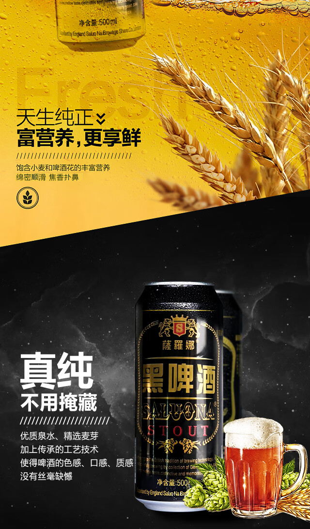 国产/进口:国产;产地:中国大陆;适用场景:野餐出游,礼节拜访,家庭聚会,自斟自饮,情侣约会,烧烤撸串,派对必备,酒吧夜店;包装:整箱装;容量:500mL;类别:黑啤酒;原料:水、大麦芽、小麦芽、焦香黑麦芽、淀粉、啤酒花;保质期:12个月;酒精度:4.3;原产地:中国大陆;原麦汁浓度:11;存储方法:避光;产品重量:12.5kg;容量:500ml;包装清单:萨罗娜黑啤酒24听;