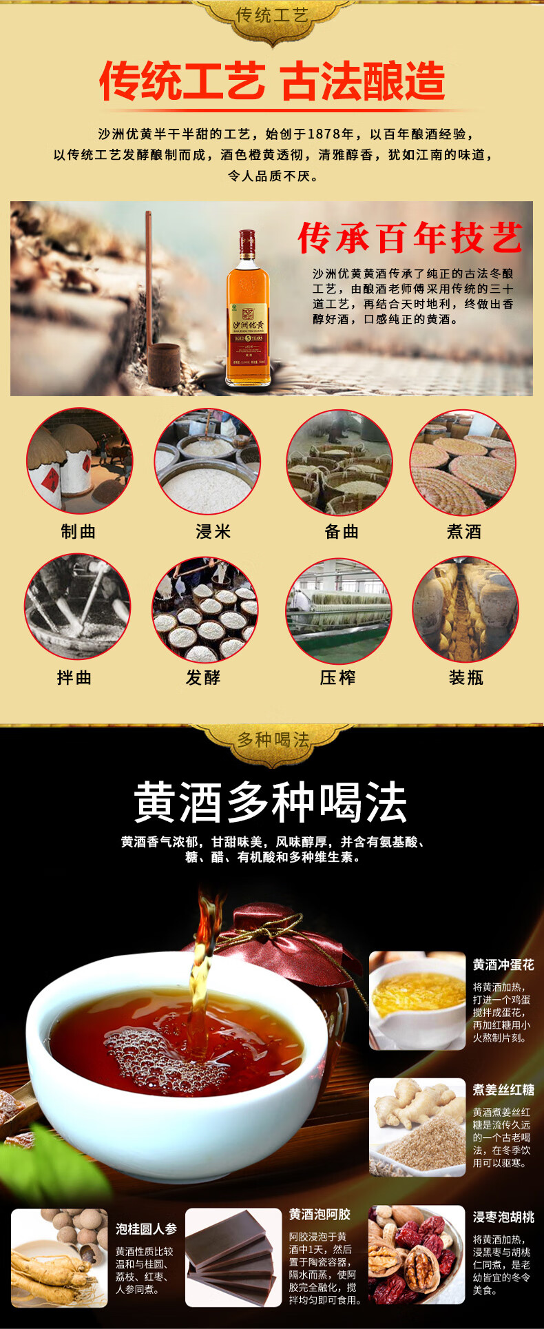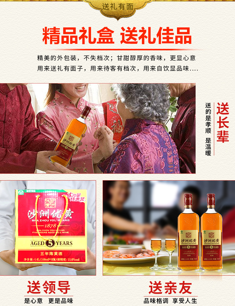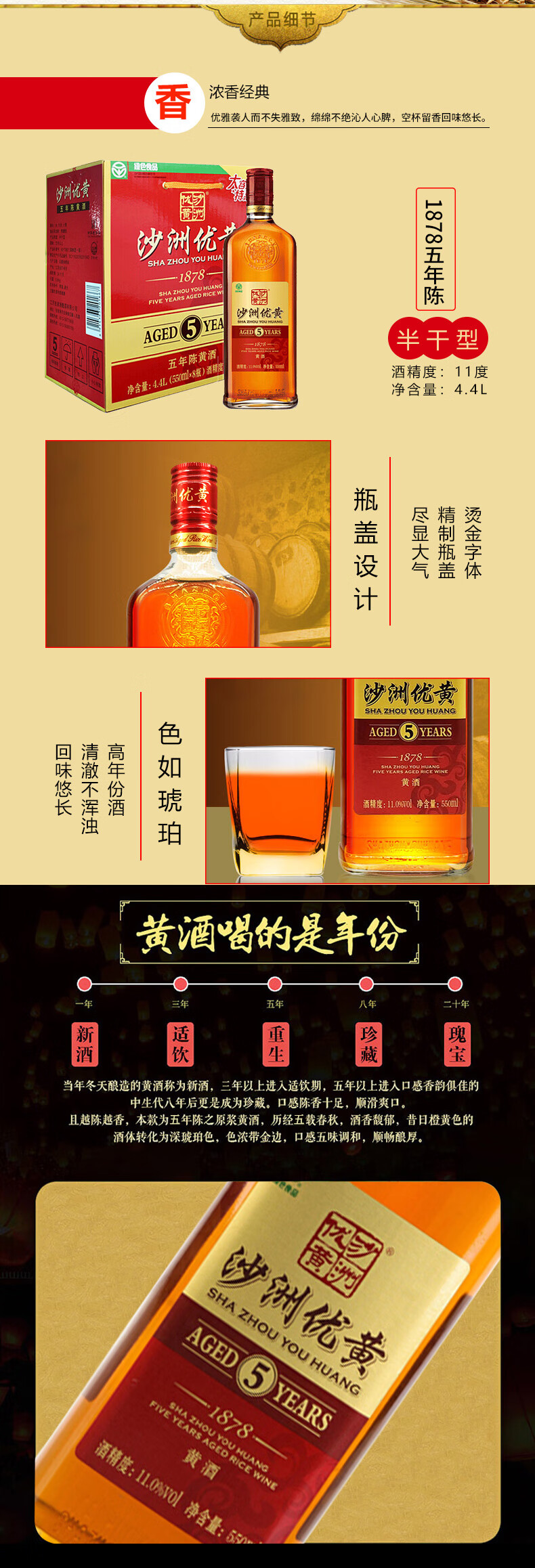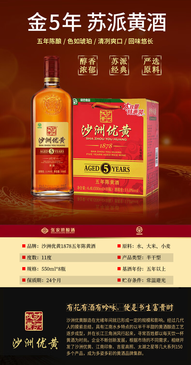 口味:半干型黄酒(总糖:15.0-40.0g/L);度数:10-19度;产地:江苏;适用场景:家庭聚会,礼节拜访,商务宴请,自斟自饮,朋友小聚;包装:整箱装;容量:1-5L;保质期:24个月;口味:半干型黄酒(总糖:15.0-40.0g/L);酒精度:11%vol;原产地:江苏;存储方法:常温 避光;包装:整箱装;容量:4400mL;产品重量:0kg;包装清单:沙洲优黄1878五年陈550ml*8瓶;