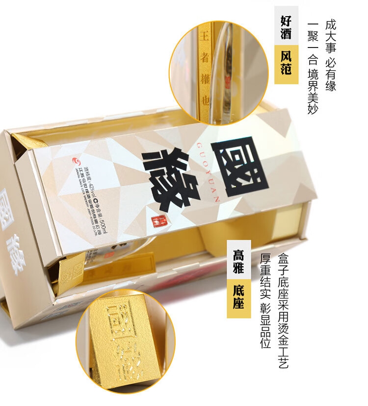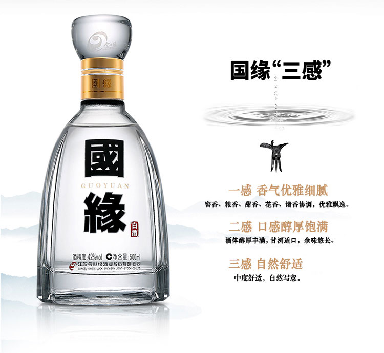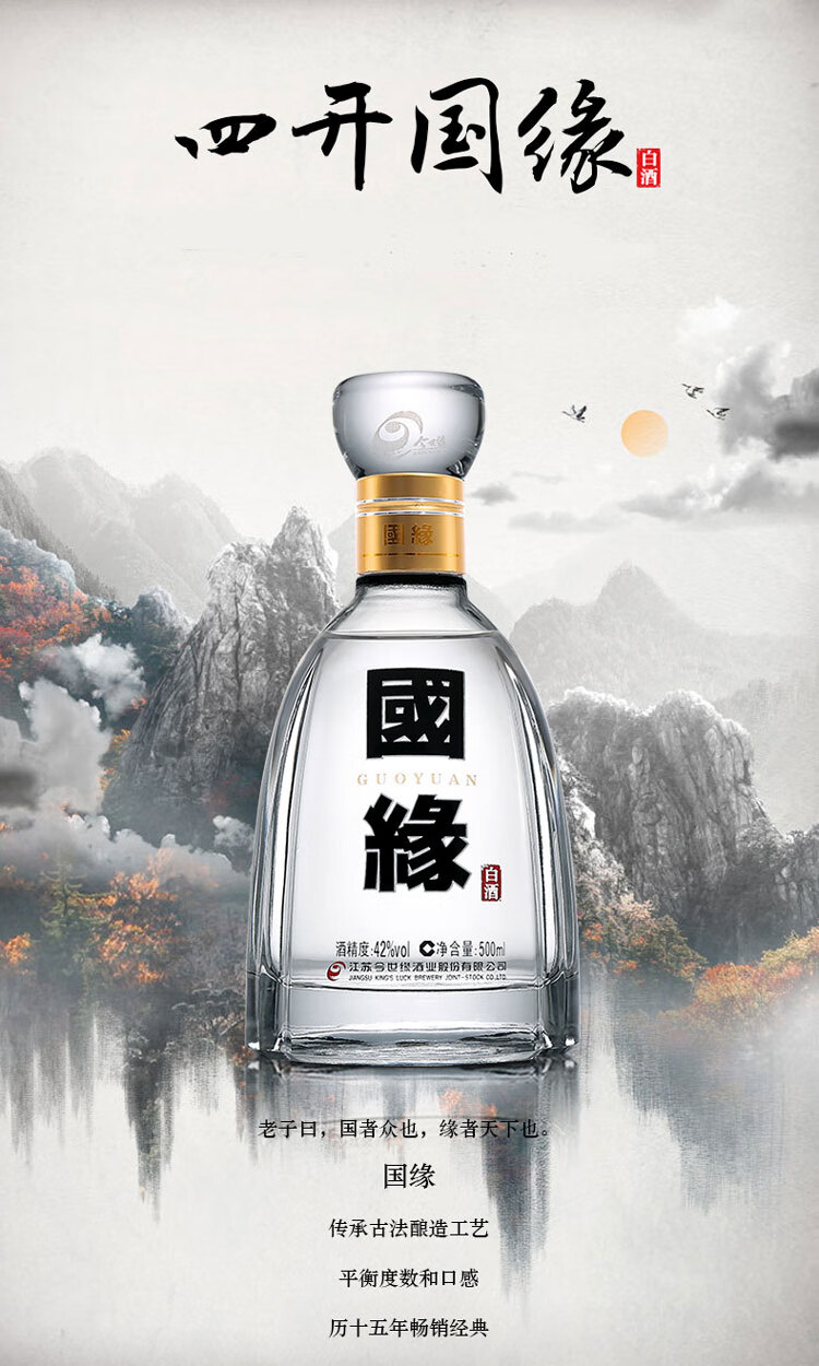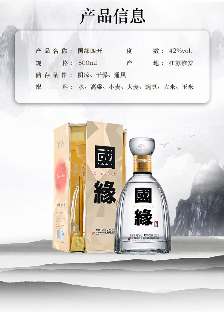 包装:瓶装;容量:376-499mL;香型:浓香型;产地:江苏;度数:40-49度;酒精度:42%vol;容量:500ml;产品重量:500g;包装清单:今世缘 白酒 国缘四开 幽雅醇厚型 42度 500ml 送礼白酒;