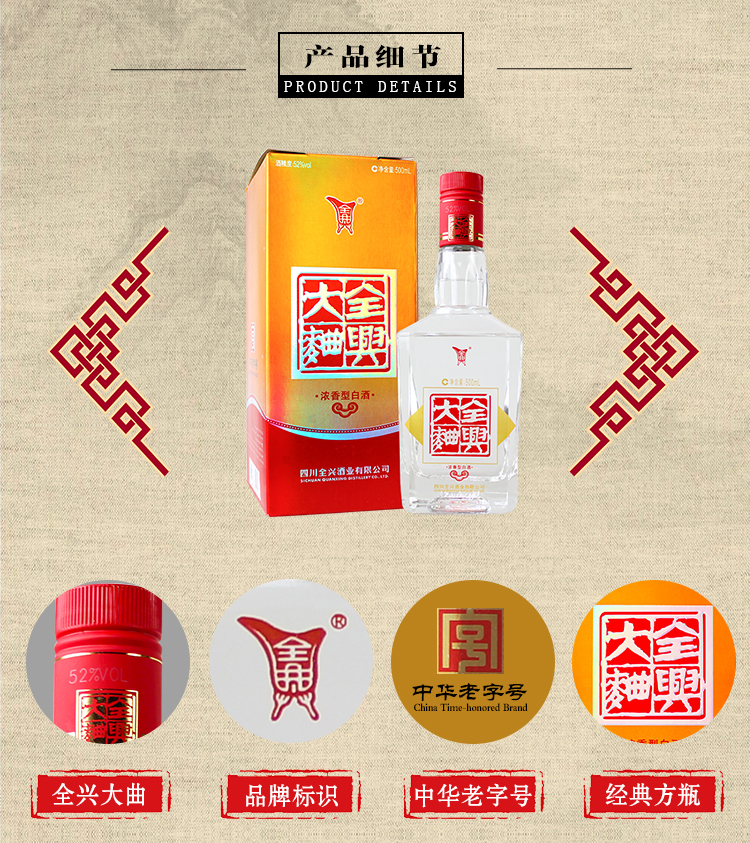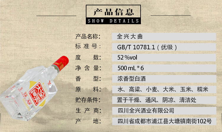 包装:整箱装;容量:376-499mL;香型:浓香型;产地:四川;度数:50度及以上;酒精度:52%vol;容量:500ml;产品重量:0g;包装清单:500ml*6瓶;