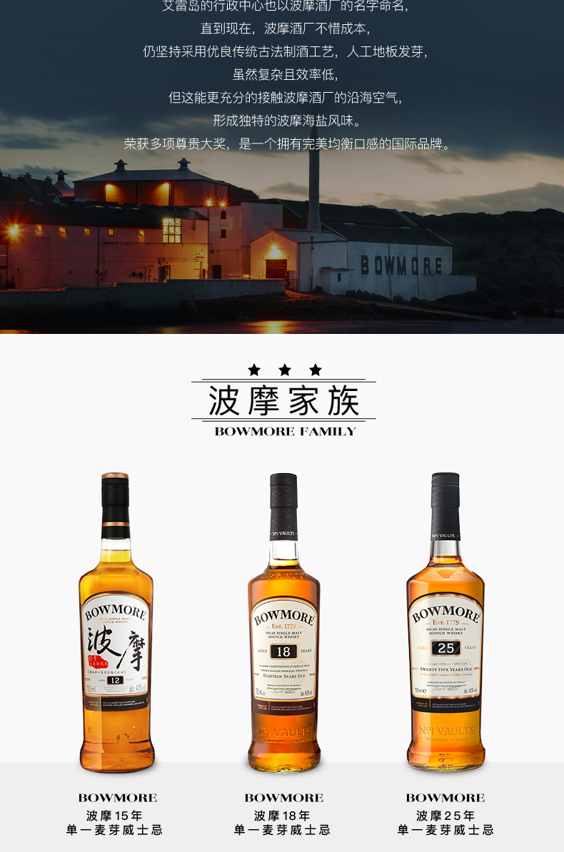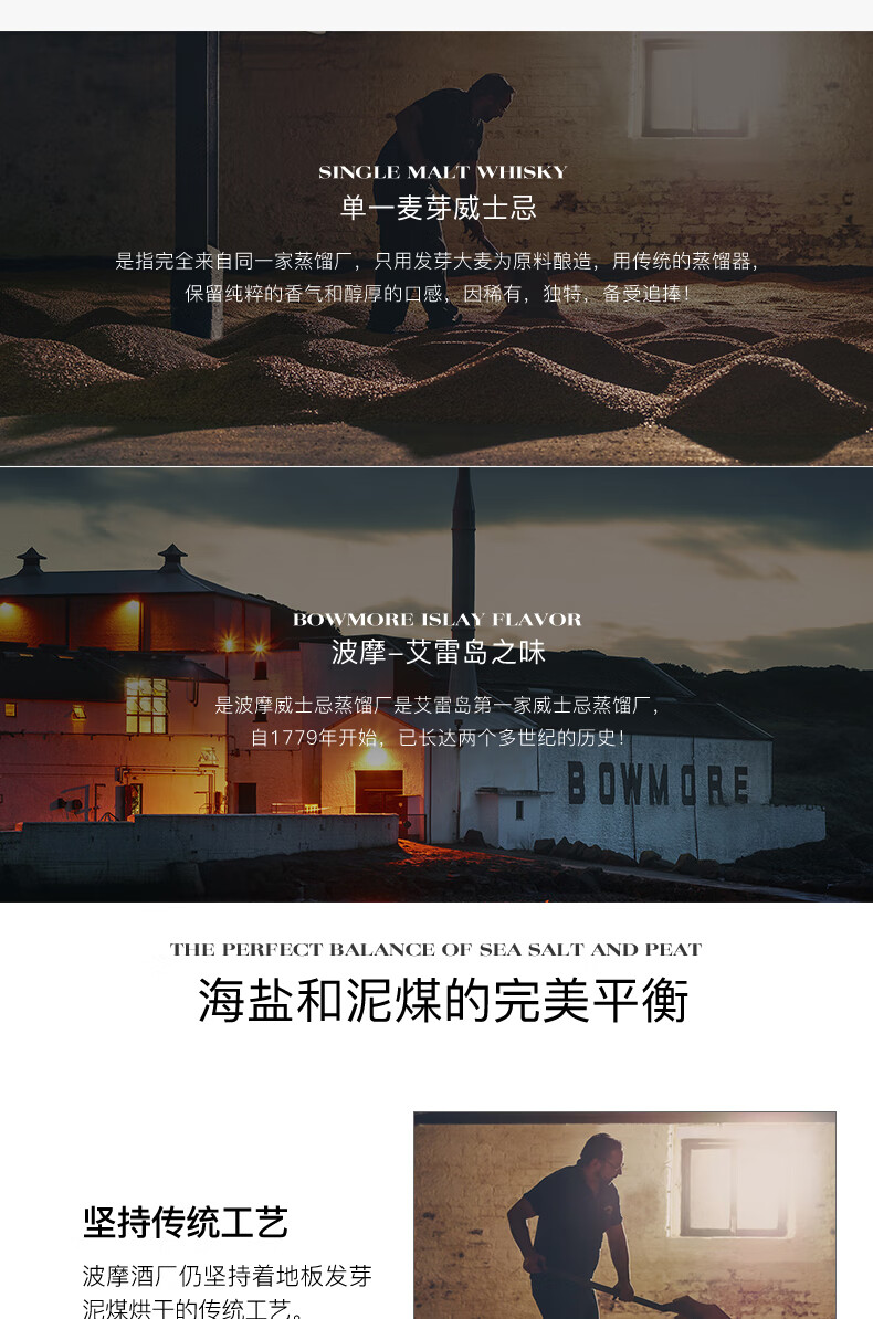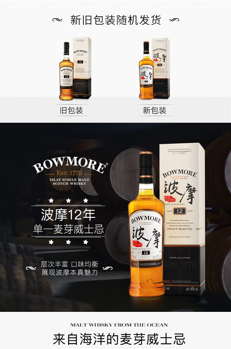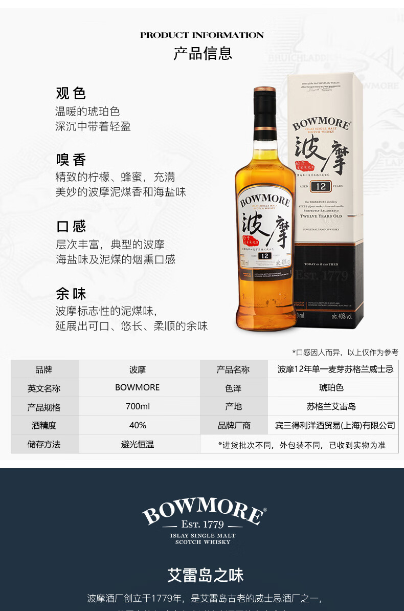 类型:单一麦芽威士忌;产地:苏格兰;适用场景:情侣约会,闺蜜私语,自斟自饮,亲友馈赠,家庭聚会,商务宴请;包装:瓶装;容量:700-999mL;阶段:进阶优选;原料:水、麦芽、焦糖色;保质期:长期保存;酒精度:40%vol;存储方法:常温避光保存;产品重量:1.24kg;容量:700mL;包装清单:波摩(Bowmore)洋酒 12年艾莱单一麦芽苏格兰威士忌 700ml*1;