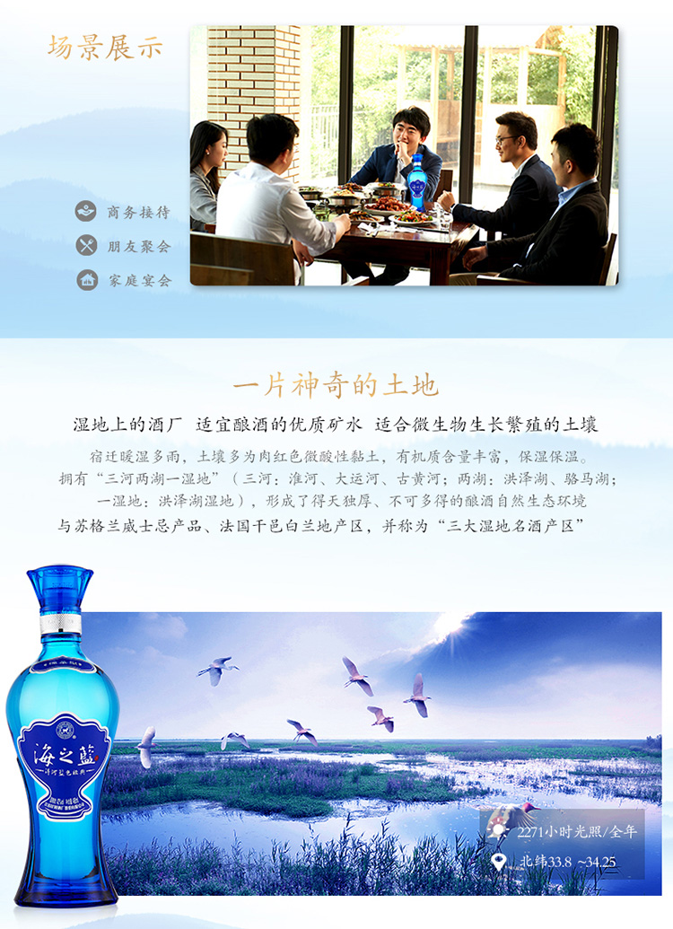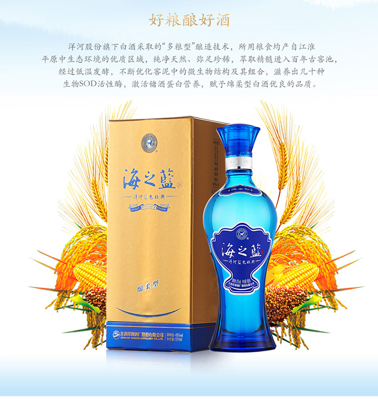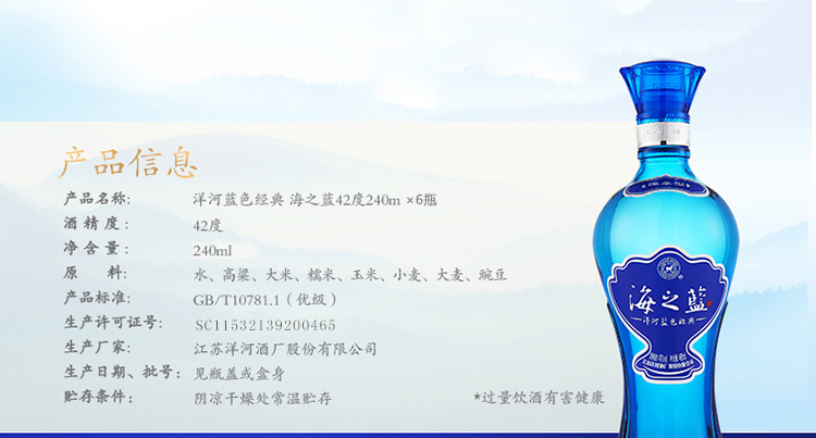包装:整箱装;容量:375mL及以下;香型:浓香型;产地:江苏;度数:40-49度;酒精度:42%vol;容量:240ml;产品重量:5200g;包装清单:洋河蓝色经典 海之蓝 42度 整箱装白酒 240ml*6 (内含3个礼袋) 口感绵柔浓香型白酒;