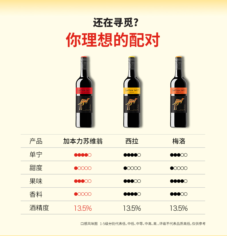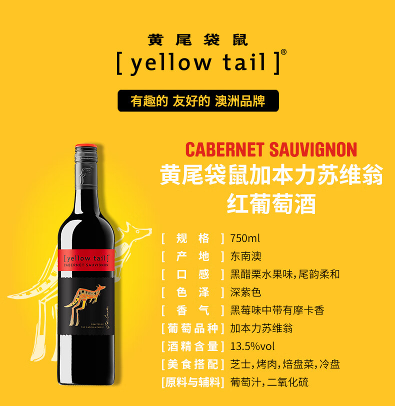颜色:砖红色;口感:柔和;特性:普通餐酒;国产/进口:进口;适用场景:家庭聚会,自斟自饮,派对活动;包装:整箱装;酸度:低酸;类别:红葡萄酒;葡萄品种:赤霞珠(Cabernet Sauvignon);类型:静止酒;香型:花香,果香;产地:澳大利亚;容量:750mL;甜度:半干型;系列:普通系列;保质期:以实际收货为准;酒精度:13.5%vol;原产地:澳大利亚;存储方法:避光、卧放或倒放、常温贮藏;容量:750ml;产品重量:7.26kg;包装清单:黄尾袋鼠加本力苏维翁红葡萄酒整箱 750ml*6瓶;