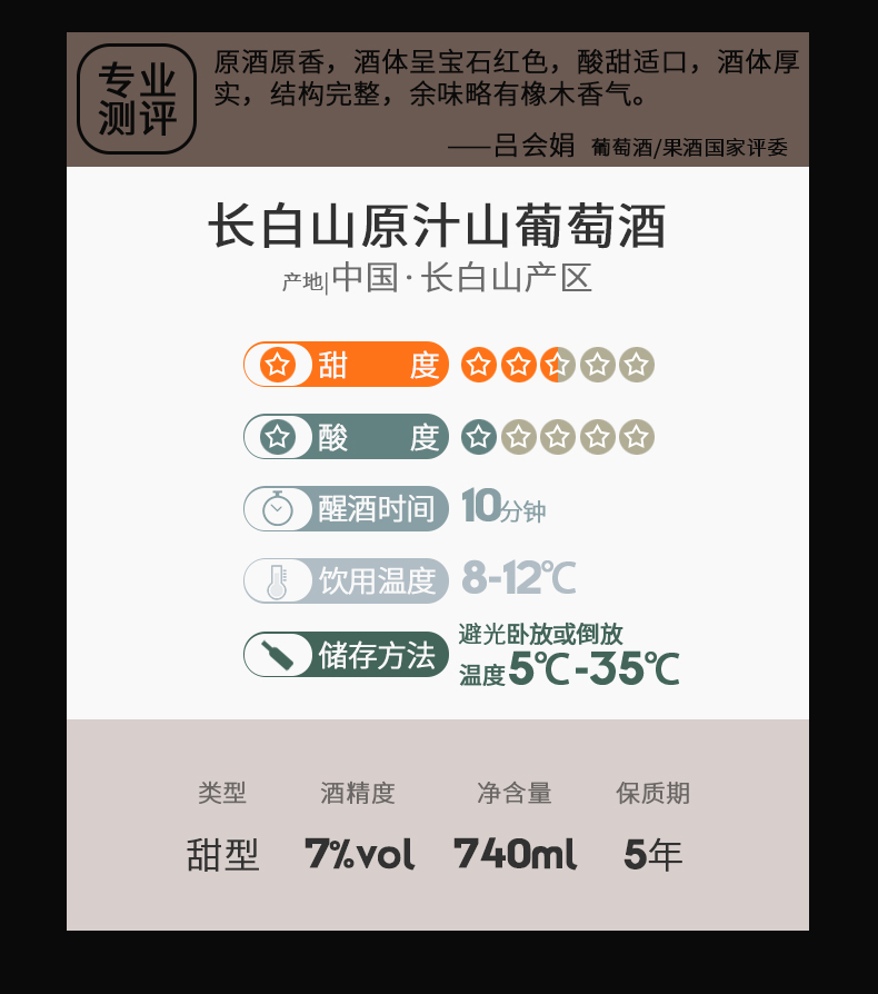 颜色:宝石红;采摘年份:2018年;口感:柔和;特性:普通餐酒;国产/进口:国产;适用场景:家庭聚会,礼节拜访,商务宴请,婚礼婚宴,情侣约会,自斟自饮,闺蜜私语,派对活动;包装:瓶装;酸度:低酸;类别:红葡萄酒;葡萄品种:其它;类型:静止酒;香型:果香,植物;产地:中国大陆;容量:376-749mL;甜度:甜型;保质期:5年;酒精度:7%vol;原产地:中国大陆;存储方法:5℃-35℃避光、倒放或卧放为宜;容量:740ml*6;产品重量:8.07kg;包装清单:原汁山葡萄酒740ml*1箱/6瓶;