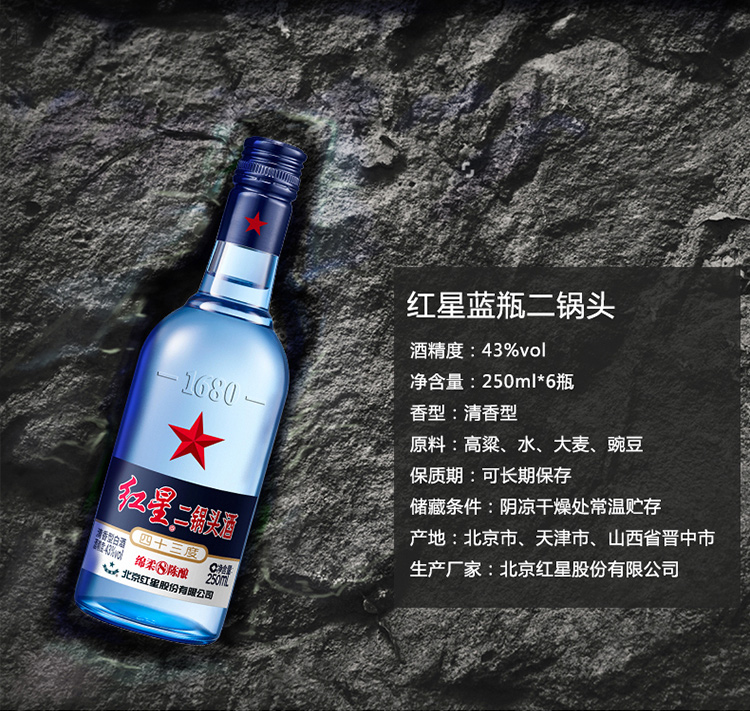 包装:整箱装;容量:375mL及以下;香型:清香型;度数:40-49度;产地:北京市,天津市,山西晋中市;酒精度:43%vol;产品重量:3110g;容量:250ml;包装清单:红星蓝瓶二锅头 绵柔8陈酿 43度 250ml*6;