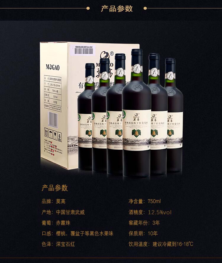 颜色:宝石红;口感:柔和;特性:有机葡萄酒;国产/进口:国产;适用场景:礼节拜访,商务宴请,婚礼婚宴,情侣约会,家庭聚会,自斟自饮,闺蜜私语,派对活动;包装:整箱装;酸度:低酸;类别:红葡萄酒;葡萄品种:赤霞珠(Cabernet Sauvignon);类型:静止酒;香型:果香;产地:中国大陆;容量:750mL;甜度:干型;系列:有机系列;保质期:10年;酒精度:12.5%vol;原产地:中国大陆;存储方法:避光恒温;容量:750ml/瓶;产品重量:8.27kg;包装清单:莫高有机赤霞珠干红 750ml*6瓶;