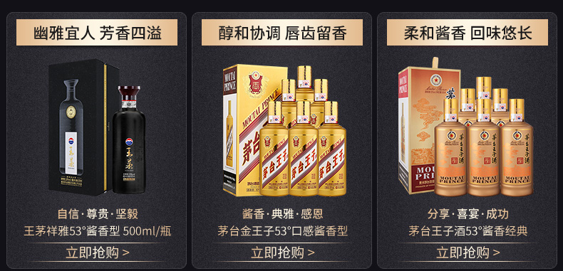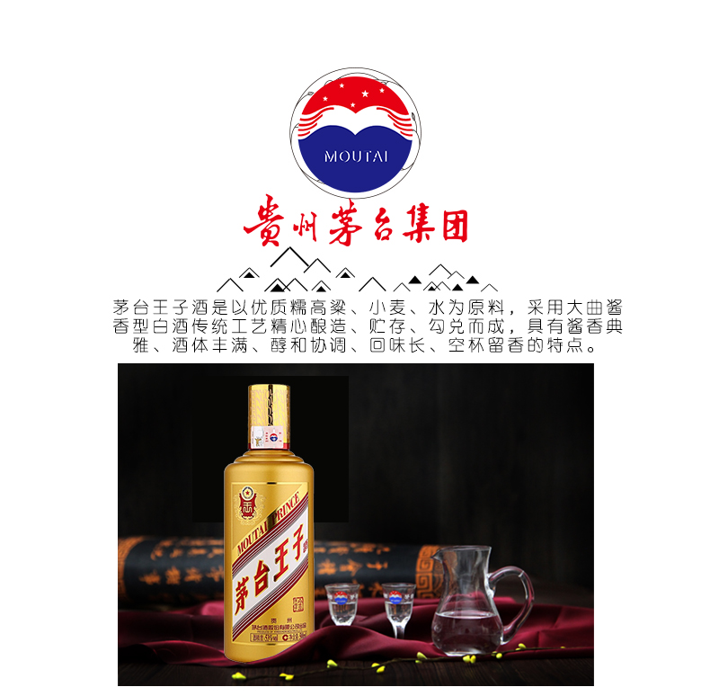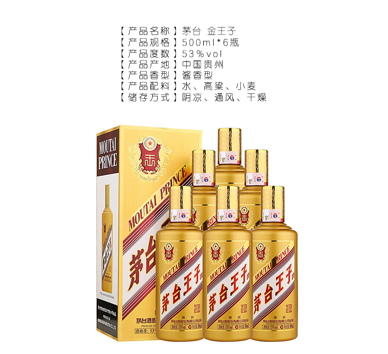 包装:整箱装;容量:500-749mL;香型:酱香型;度数:50度及以上;香型:酱香型;产地:贵州茅台;酒精度:53%vol;包装:整箱装;产品重量:8580g;容量:500ML;包装清单:茅台 金王子 53度 500ml*6瓶 整箱装;