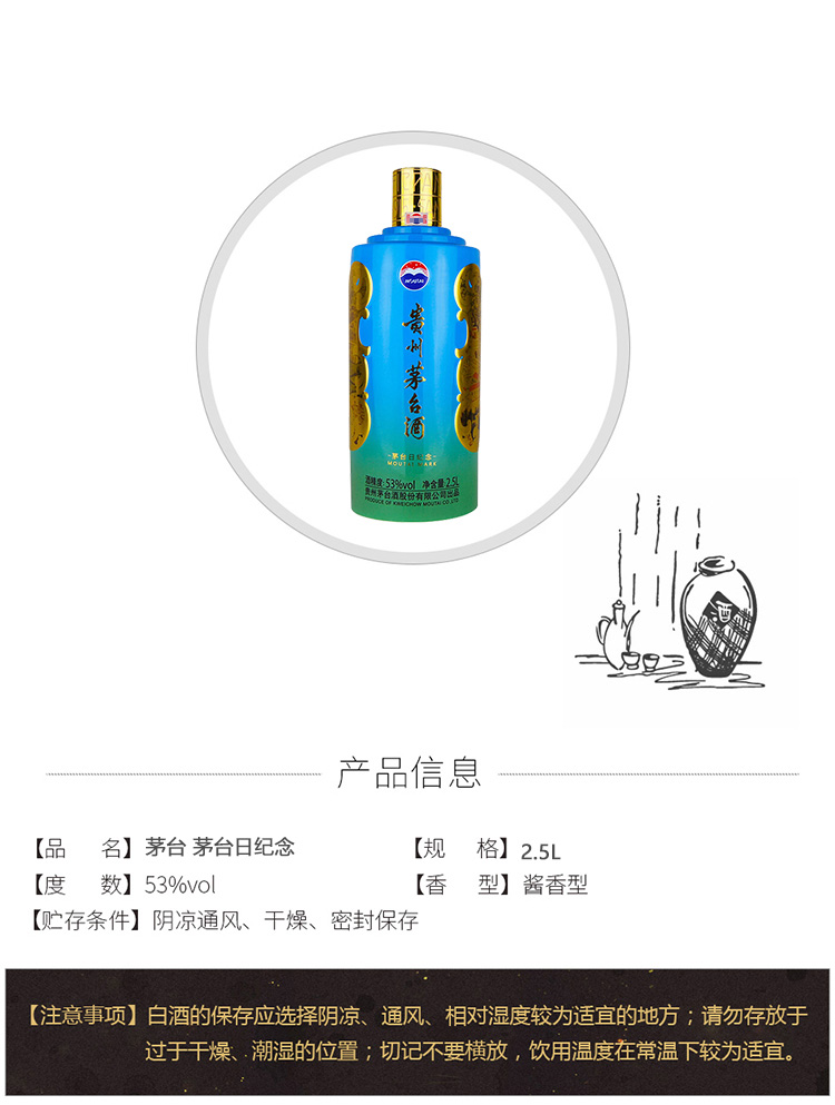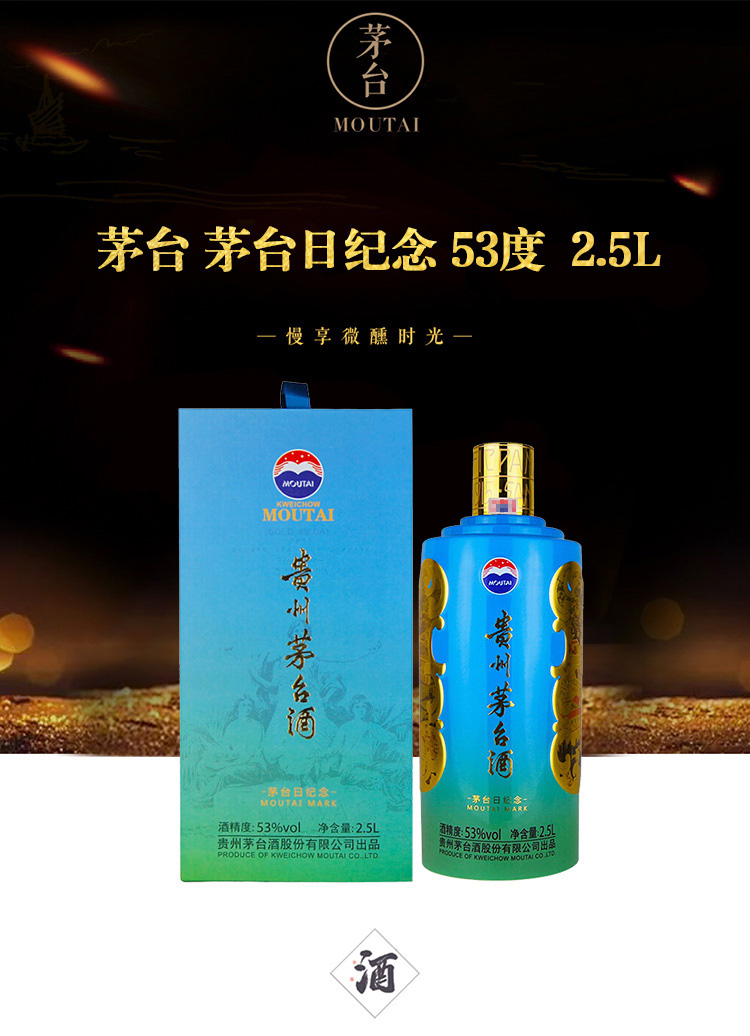 包装:瓶装;容量:750mL及以上;香型:酱香型;产地:贵州;度数:50度及以上;酒精度:53%vol;容量:2.5L;产品重量:2500g;包装清单:茅台 茅台日纪念 53度 单瓶装白酒 2.5L 口感酱香型;