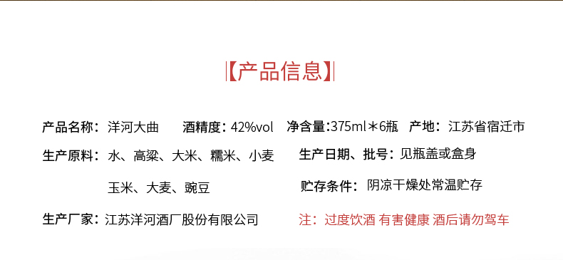 包装:整箱装;容量:376-499mL;香型:浓香型;度数:40-49度;香型:浓香型;产地:江苏;酒精度:42度;包装:整箱装;容量:375ml;产品重量:6300g;包装清单:洋河大曲 42度 整箱装 375ml*6瓶;