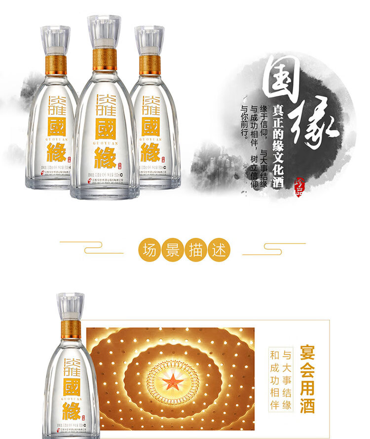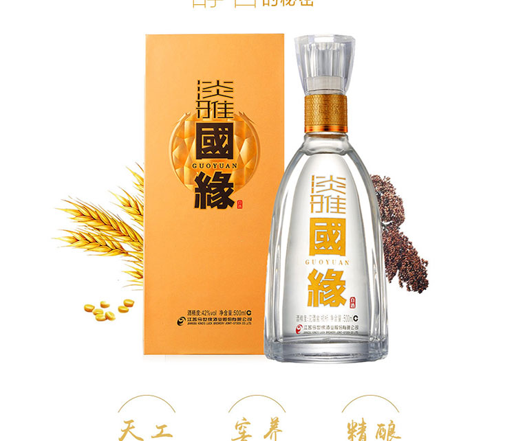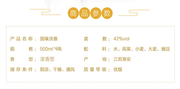 包装:整箱装;容量:500-749mL;香型:浓香型;度数:40-49度;香型:浓香型;产地:江苏;酒精度:42%vol;包装:整箱装;产品重量:3000g;容量:500;包装清单:今世缘 白酒 淡雅国缘 浓香型 42度 500ml*6瓶 整箱装 送礼白酒 新老包装随机发货(内含3个礼品袋);