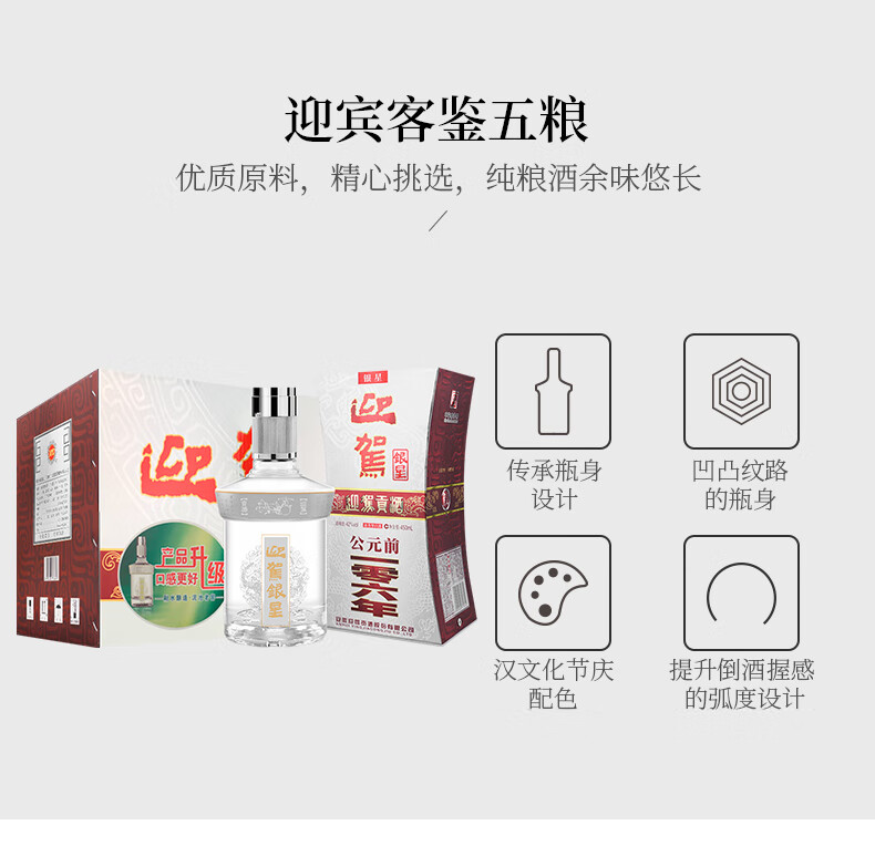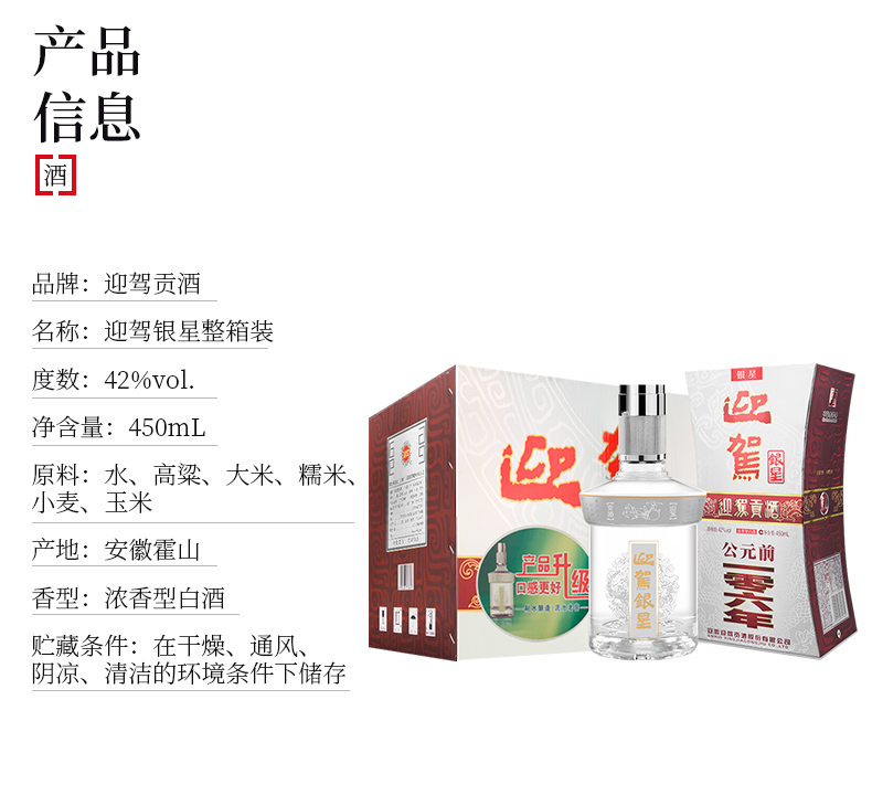 包装:整箱装;容量:376-499mL;香型:浓香型;产地:安徽;度数:40-49度;酒精度:42%vol;容量:450ml;产品重量:9300g;包装清单:迎驾贡酒 银星 42度 450mL*6、礼品袋*3;