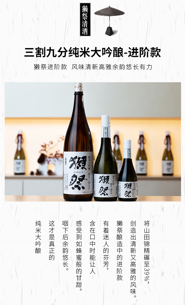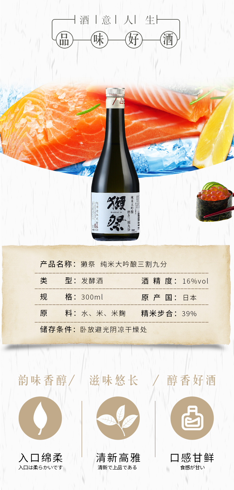 适用场景:情侣约会,亲友馈赠,自斟自饮;包装:瓶装;容量:200-374mL;国产/进口:进口;产地:日本;原料:水、大米、米曲;保质期:长期有效;酒精度:16%vol;存储方法:请放置阴凉避光处;产品重量:0kg;包装清单:獭祭纯米大吟酿三割九分清酒 300ml×1;