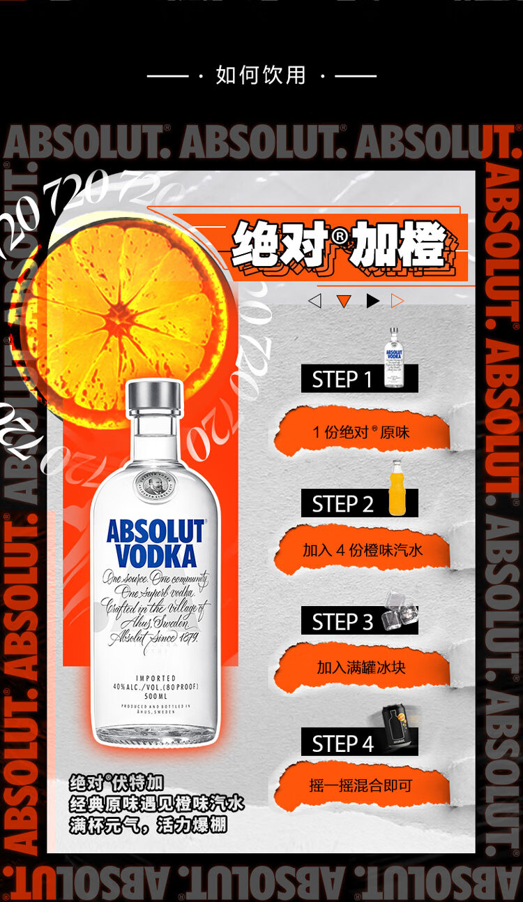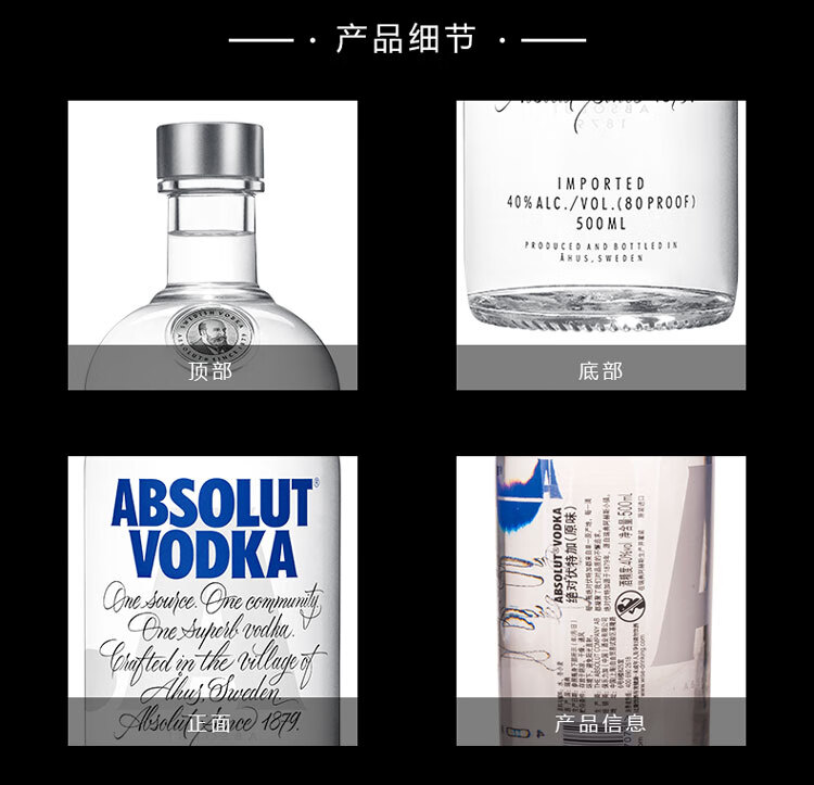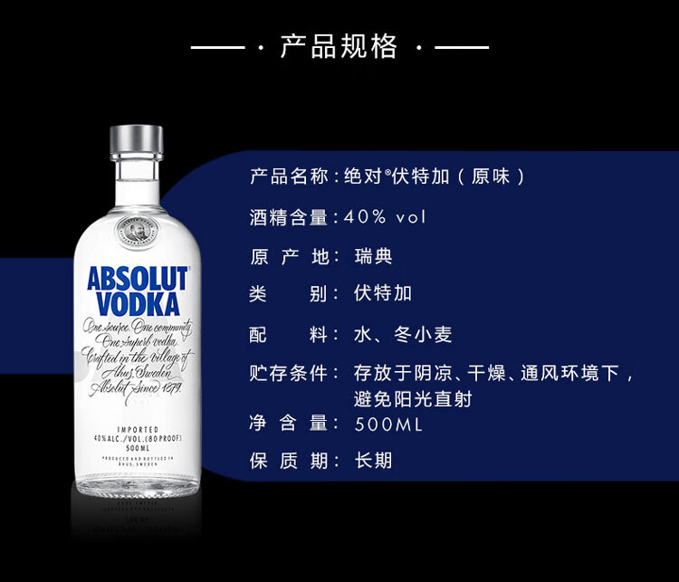 适用场景:家庭聚会,商务宴请,情侣约会,自斟自饮;包装:瓶装;容量:375-499mL;国产/进口:进口;产地:瑞典;原料:优质冬小麦、纯净深泉水;保质期:长期;酒精度:40%vol;存储方法:通风、干燥、阴凉处;容量:500mL;产品重量:0.86kg;包装清单:绝对伏特加(Absolut Vodka)洋酒 伏特加 500ml*1;