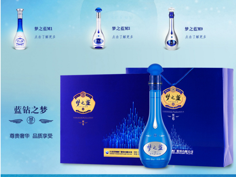 包装:礼盒装;容量:376-499mL;香型:浓香型;产地:江苏;度数:50度及以上;酒精度:52%vol;容量:500;产品重量:4600g;包装清单:梦之蓝M6 52度 礼盒装500ml*2瓶*1;