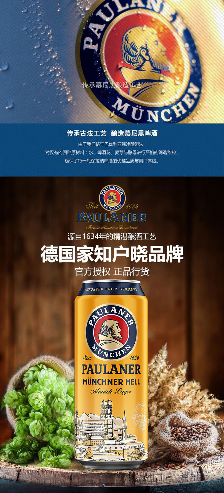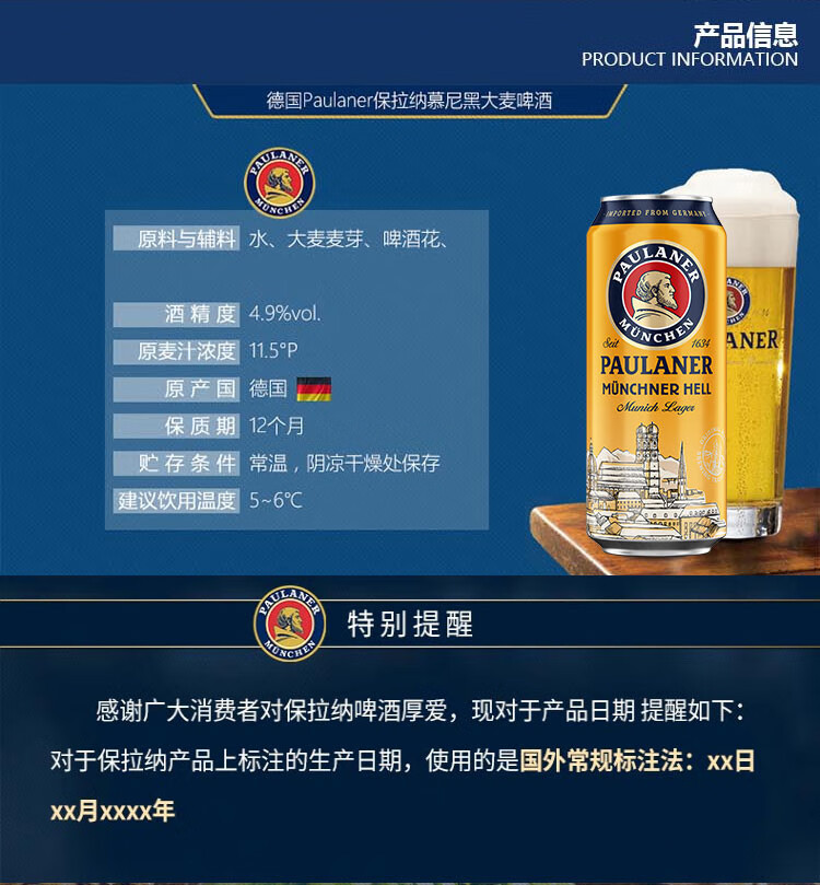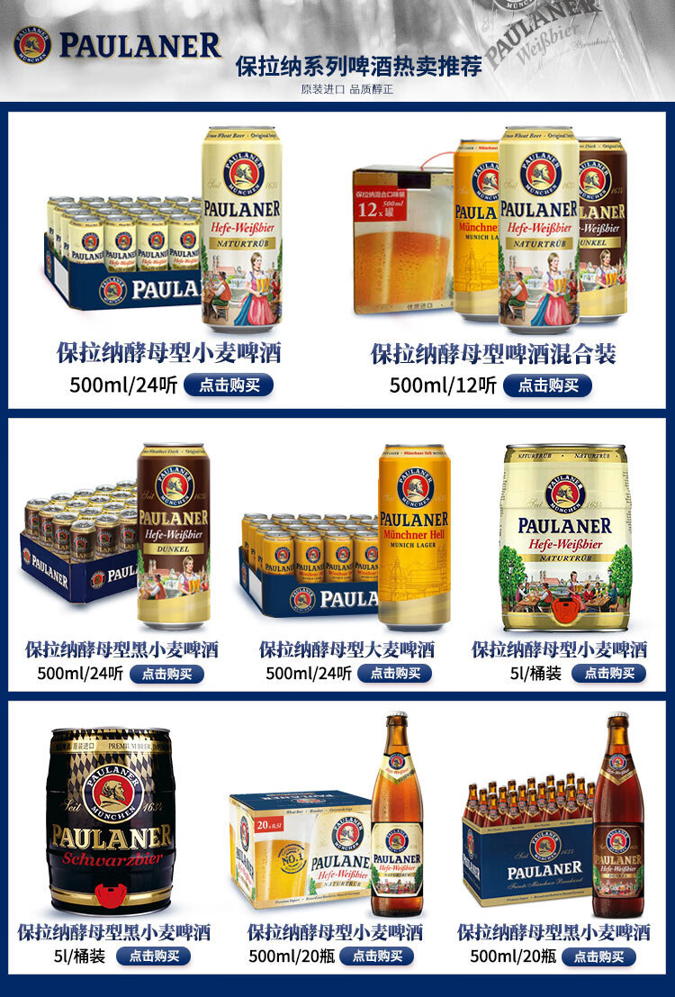国产/进口:进口;产地:德国;适用场景:家庭聚会,自斟自饮,情侣约会,烧烤撸串,派对必备;包装:听装;容量:500mL;类别:黄啤酒;原料:水、麦芽、啤酒花;系列:酵母型大麦;保质期:365天;酒精度:4.9%vol;原产地:德国;原麦汁浓度:11.5°P;存储方法:常温避光保存;产品重量:12.6kg;容量:500ml;包装清单:保拉纳/柏龙(PAULANER)慕尼黑大麦啤酒500ml*24听 整箱装 德国进口*1;