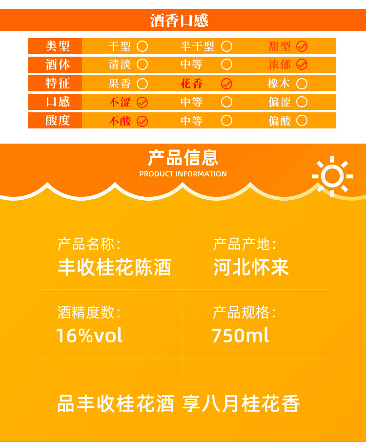 类型:静止酒;口感:柔和;香型:花香,植物;特性:其它;国产/进口:国产;产地:中国大陆;适用场景:家庭聚会,自斟自饮,闺蜜私语,派对活动;包装:瓶装;容量:750mL;甜度:甜型;类别:白葡萄酒;葡萄品种:其它;保质期:5年;酒精度:16vol;原产地:中国大陆;存储方法:立放 宜在5℃-25℃通风干燥处避光保存;容量:750;产品重量:8.4kg;包装清单:丰收桂花陈酒甜酒750ml*6瓶;